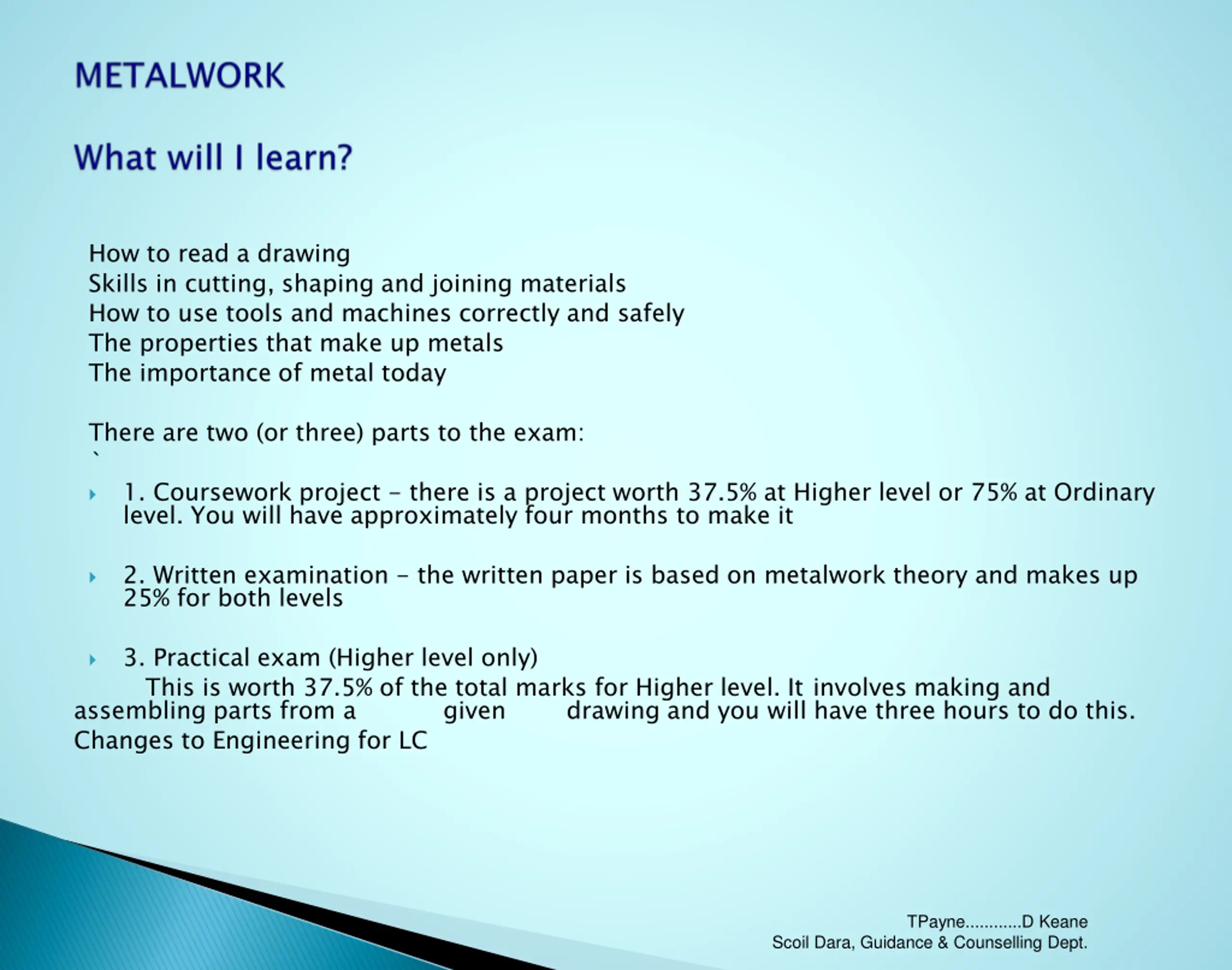 How to read a drawing Skills in cutting, shaping and joining materials How to use tools and machines correctly and safely The properties that make up metals The importance of metal today There are two (or three) parts to the exam: ` 1. Coursework project - there is a project worth 37.5% at Higher level or 75% at Ordinary level. You will have approximately four months to make it 2. Written examination - the written paper is based on metalwork theory and makes up 25% for both levels 3. Practical exam (Higher level only) This is worth 37.5% of the total marks for Higher level. It involves making and assembling parts from a Changes to Engineering for LC given drawing and you will have three hours to do this. TPayne............D Keane Scoil Dara, Guidance & Counselling Dept.