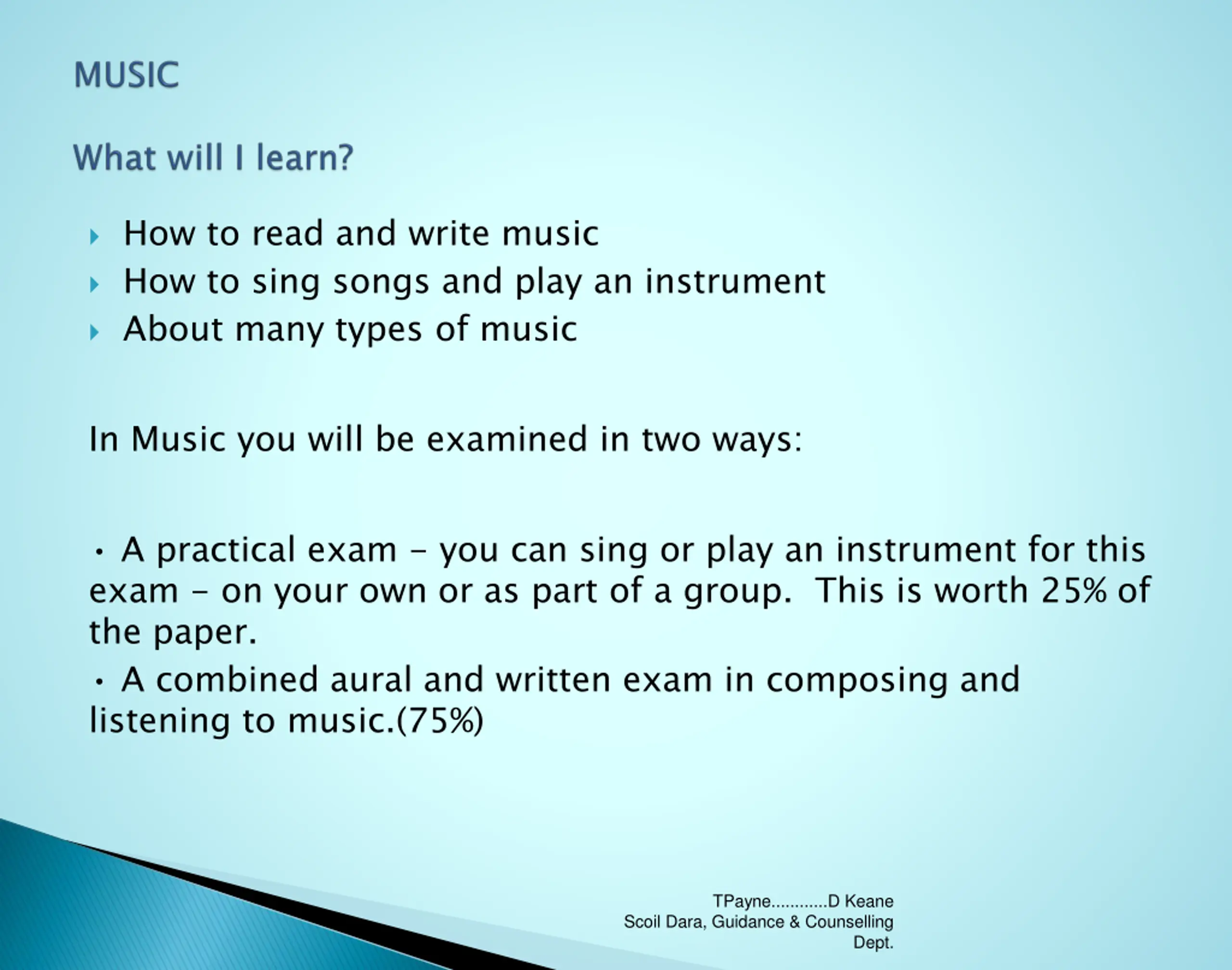How to read and write music How to sing songs and play an instrument About many types of music In Music you will be examined in two ways: A practical exam - you can sing or play an instrument for this exam - on your own or as part of a group. This is worth 25% of the paper. A combined aural and written exam in composing and listening to music.(75%) TPayne............D Keane Scoil Dara, Guidance & Counselling Dept.