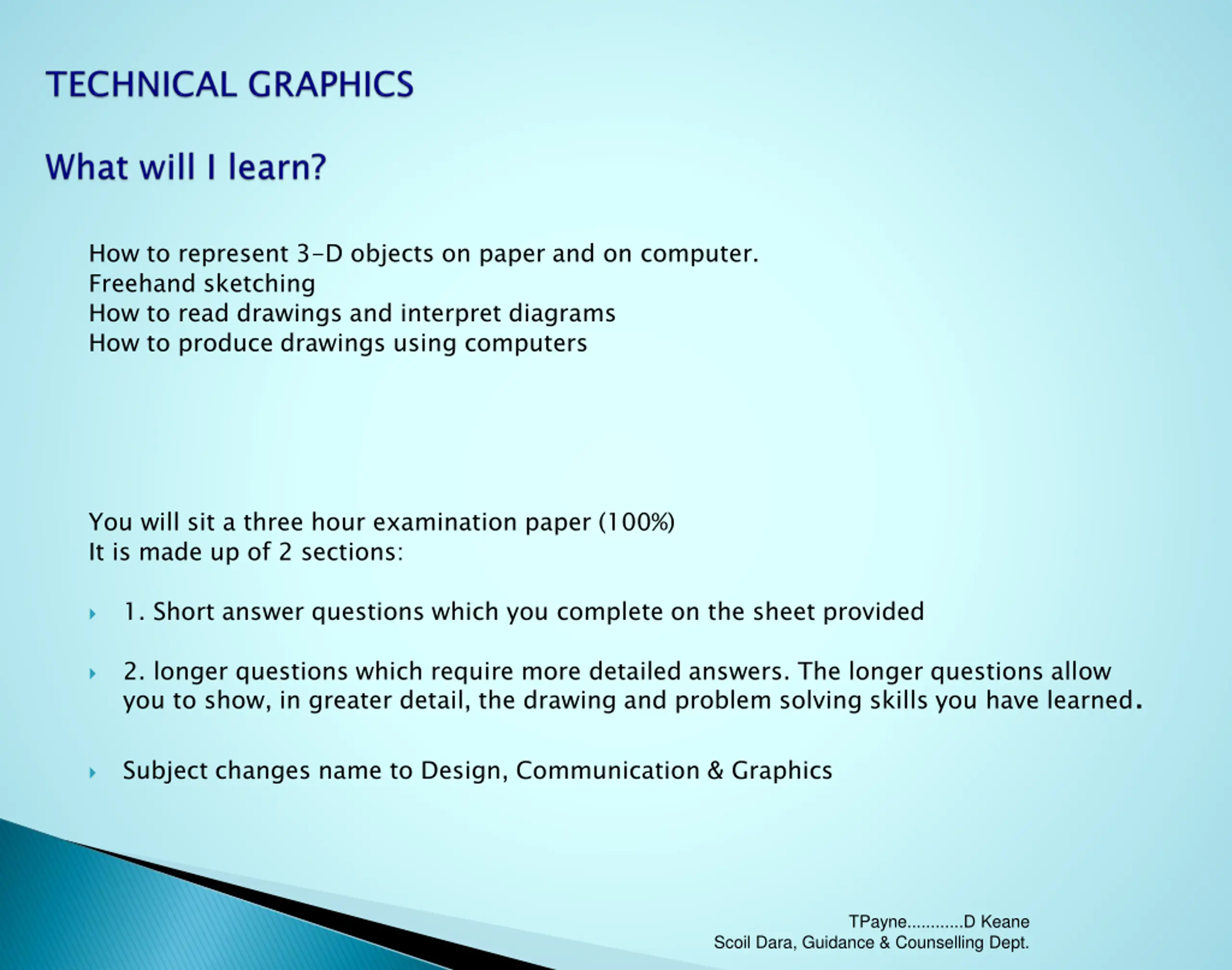 How to represent 3-D objects on paper and on computer. Freehand sketching How to read drawings and interpret diagrams How to produce drawings using computers You will sit a three hour examination paper (100%) It is made up of 2 sections: 1. Short answer questions which you complete on the sheet provided 2. longer questions which require more detailed answers. The longer questions allow you to show, in greater detail, the drawing and problem solving skills you have learned. Subject changes name to Design, Communication & Graphics TPayne............D Keane Scoil Dara, Guidance & Counselling Dept.