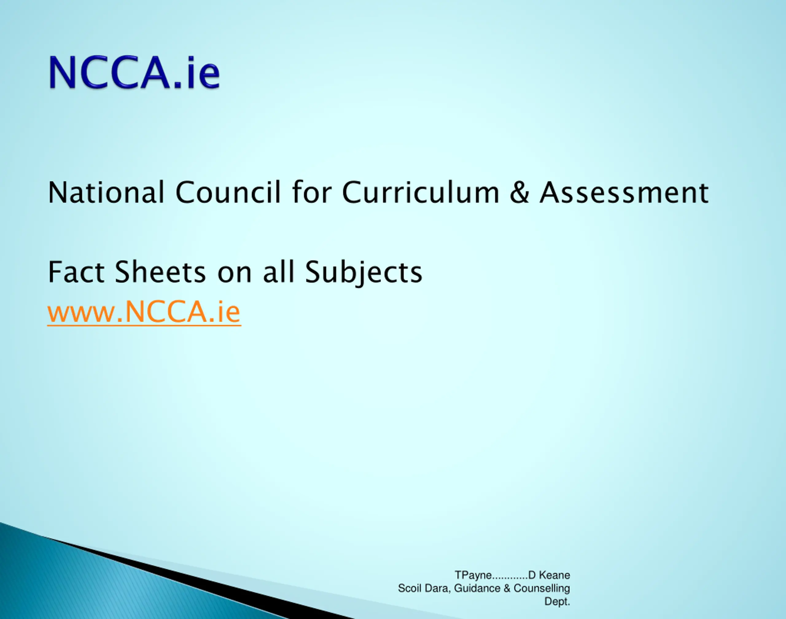 National Council for Curriculum & Assessment Fact Sheets on all Subjects www.NCCA.ie TPayne............D Keane Scoil Dara, Guidance & Counselling Dept.