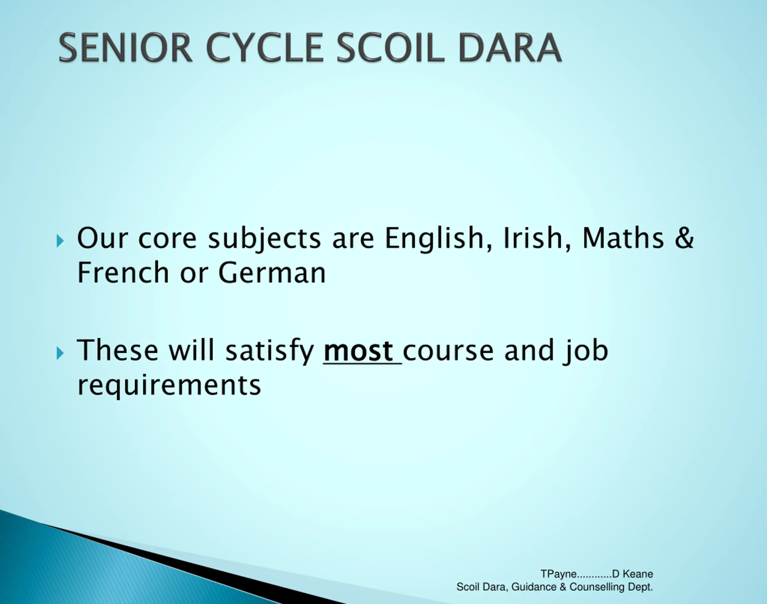 Our core subjects are English, Irish, Maths & French or German These will satisfy most requirements most course and job TPayne............D Keane Scoil Dara, Guidance & Counselling Dept.