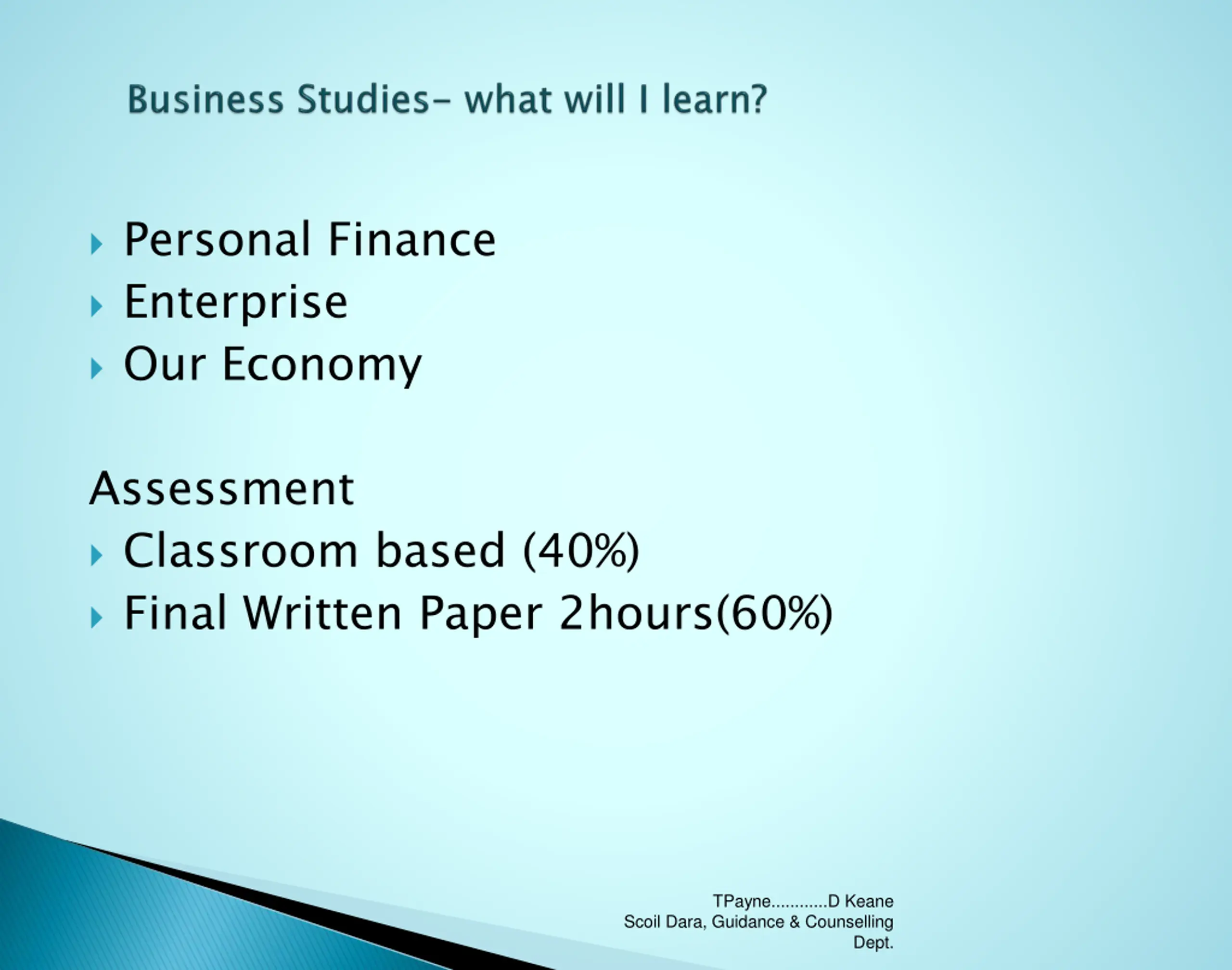 Personal Finance Enterprise Our Economy Assessment Classroom based (40%) Final Written Paper 2hours(60%) TPayne............D Keane Scoil Dara, Guidance & Counselling Dept.