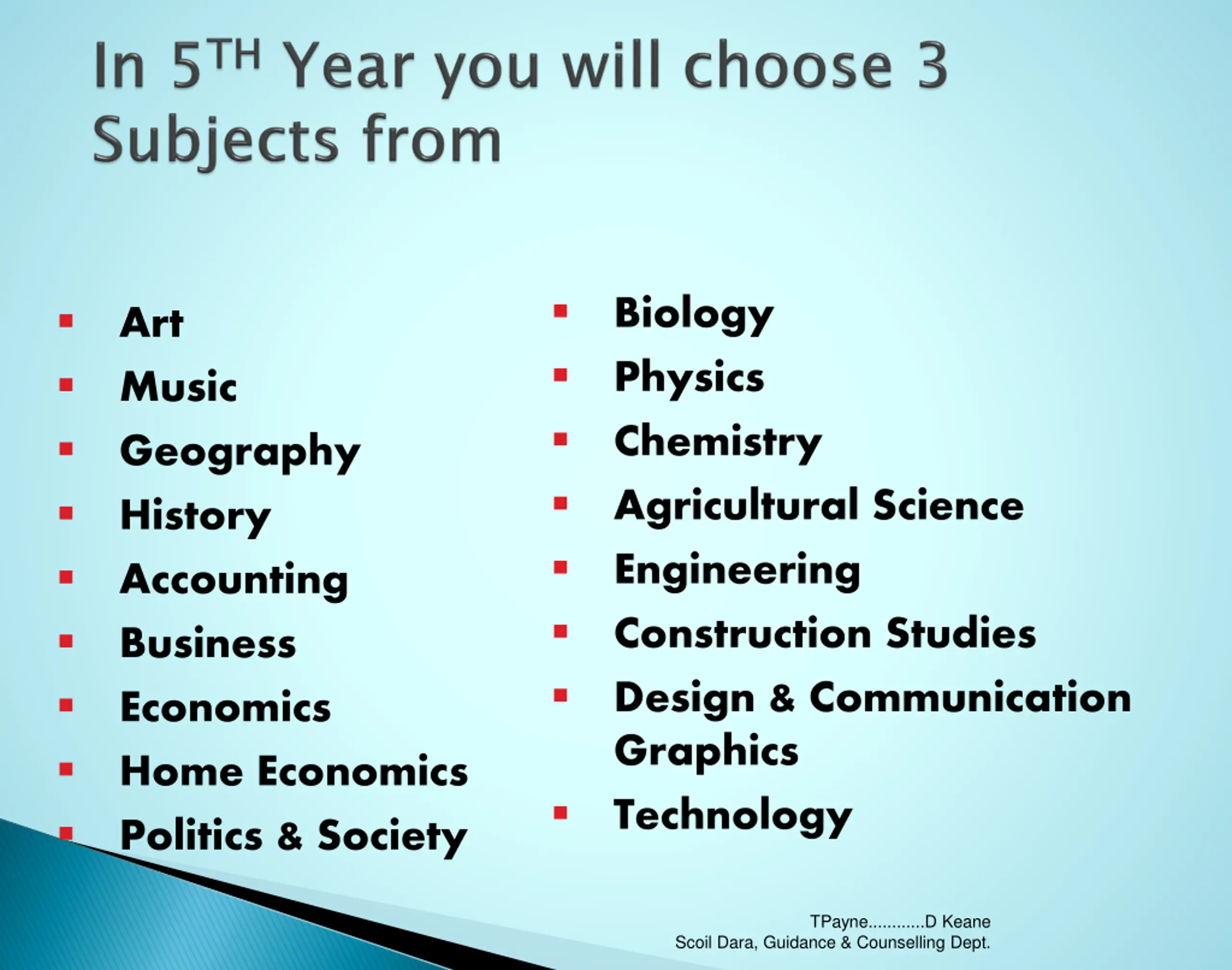 Biology Physics Chemistry Agricultural Science Engineering Construction Studies Design & Communication Graphics Technology Art Music Geography History Accounting Business Economics Home Economics Politics & Society TPayne............D Keane Scoil Dara, Guidance & Counselling Dept.