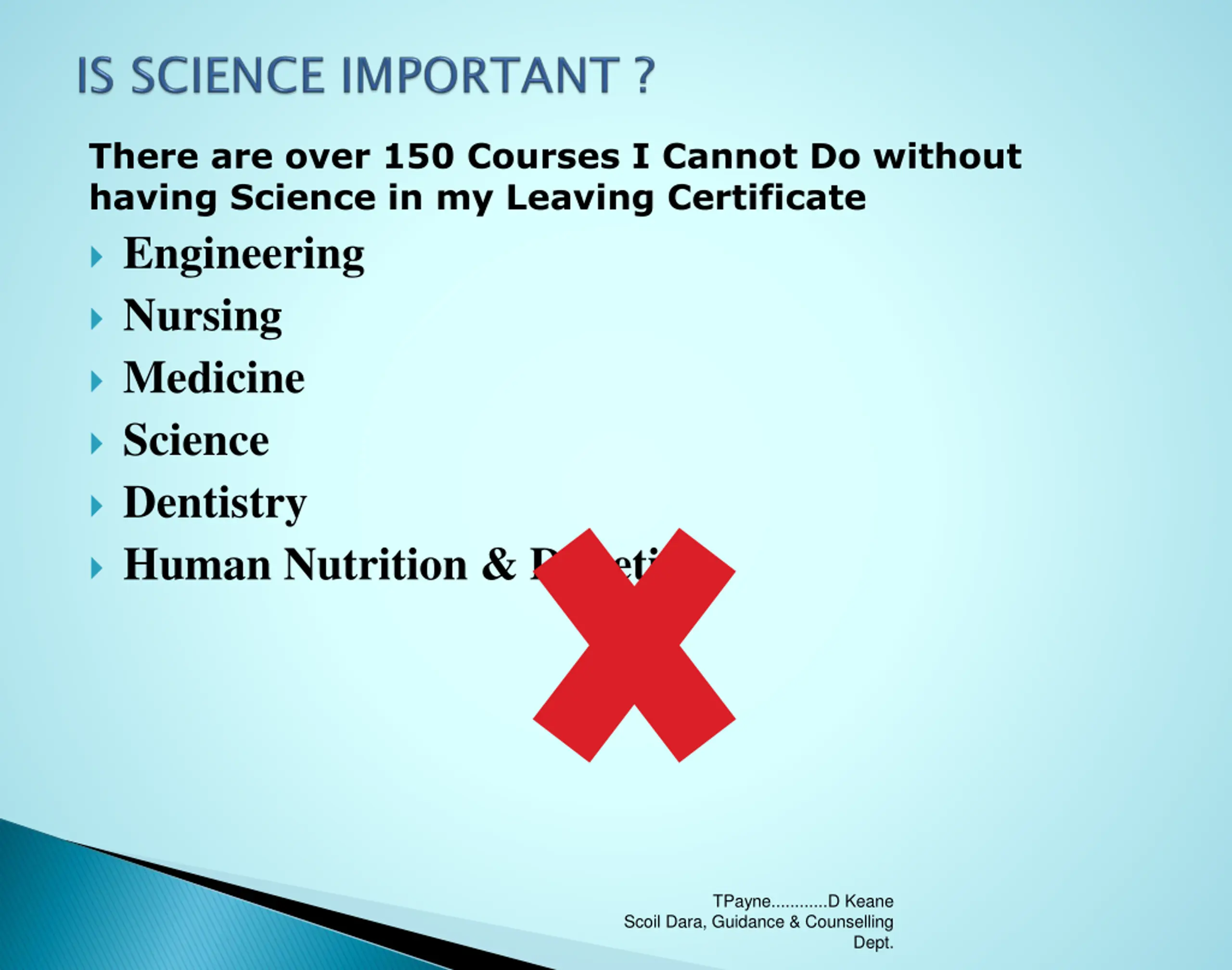 There are over 150 Courses I Cannot Do without having Science in my Leaving Certificate Engineering Nursing Medicine Science Dentistry Human Nutrition & Dietetics TPayne............D Keane Scoil Dara, Guidance & Counselling Dept.