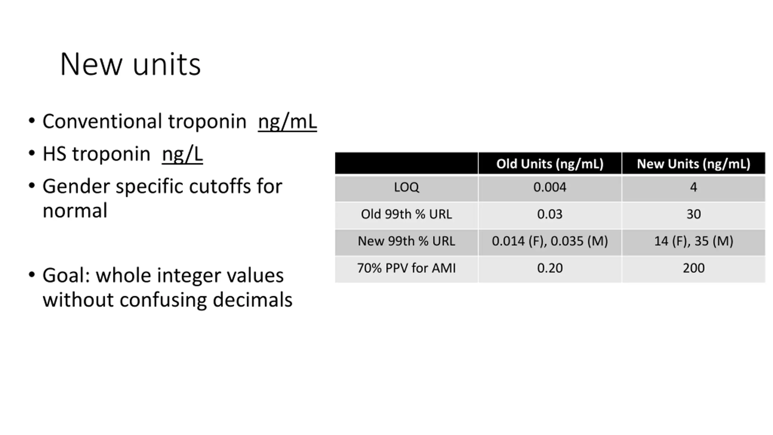 New units Conventional troponin ng/mL HS troponin ng/L Gender specific cutoffs for normal Old Units (ng/mL) New Units (ng/mL) LOQ 0.004 4 Old 99th % URL 0.03 30 New 99th % URL 0.014 (F), 0.035 (M) 14 (F), 35 (M) 70% PPV for AMI 0.20 200 Goal: whole integer values without confusing decimals