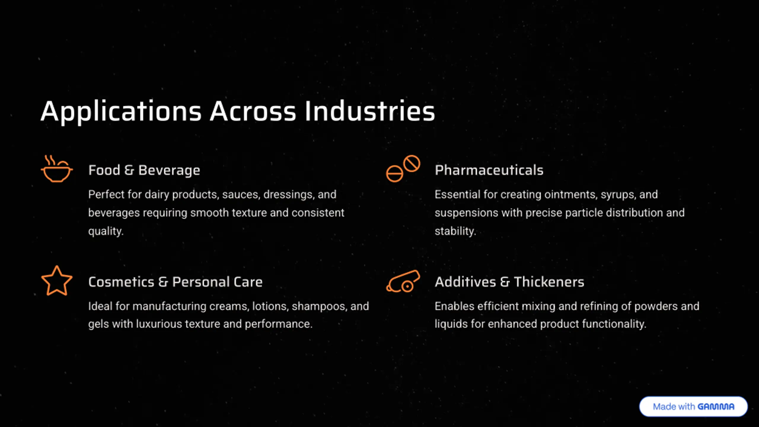 Applications Across Industries Food & Beverage Pharmaceuticals Perfect for dairy products, sauces, dressings, and beverages requiring smooth texture and consistent quality. Essential for creating ointments, syrups, and suspensions with precise particle distribution and stability. Cosmetics & Personal Care Additives & Thickeners Ideal for manufacturing creams, lotions, shampoos, and gels with luxurious texture and performance. Enables efficient mixing and refining of powders and liquids for enhanced product functionality.