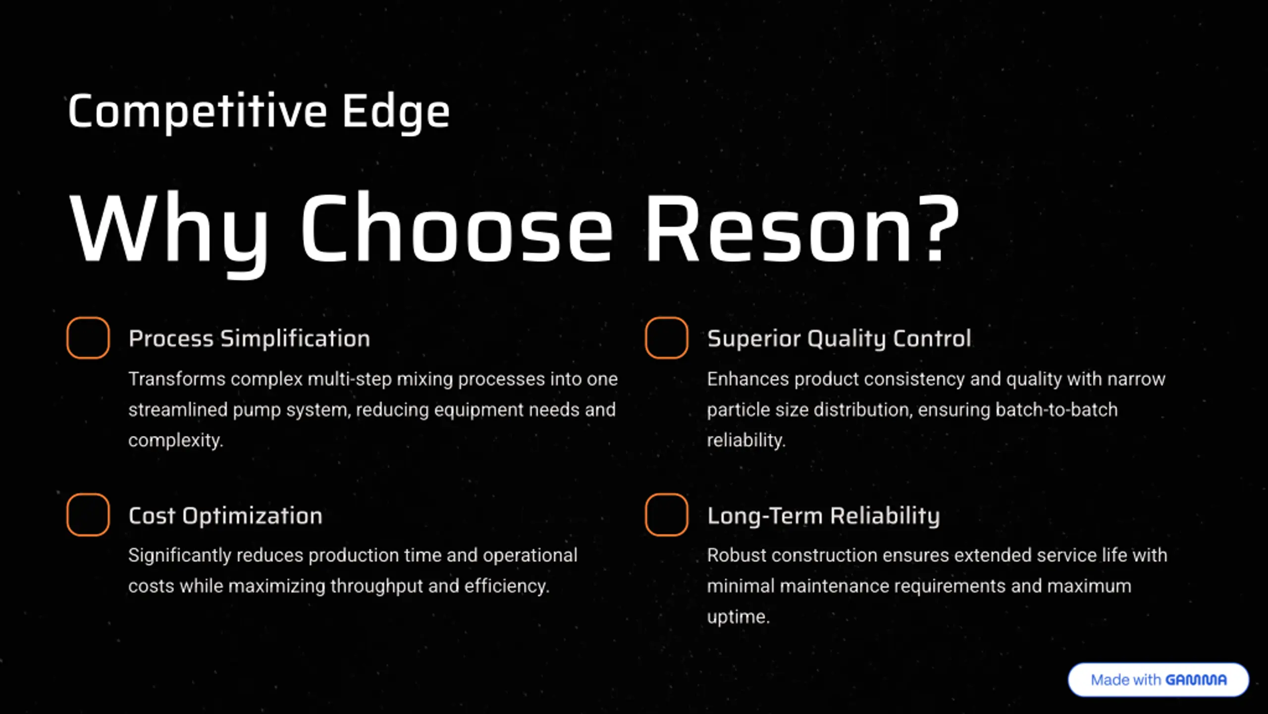Competitive Edge Why Choose Reson? Process Simplification Superior ?uality Control Transforms complex multi-step mixing processes into one streamlined pump system, reducing equipment needs and complexity. Enhances product consistency and quality with narrow particle size distribution, ensuring batch-to-batch reliability. Cost Optimization Long-Term Reliability Significantly reduces production time and operational costs while maximizing throughput and efficiency. Robust construction ensures extended service life with minimal maintenance requirements and maximum uptime.