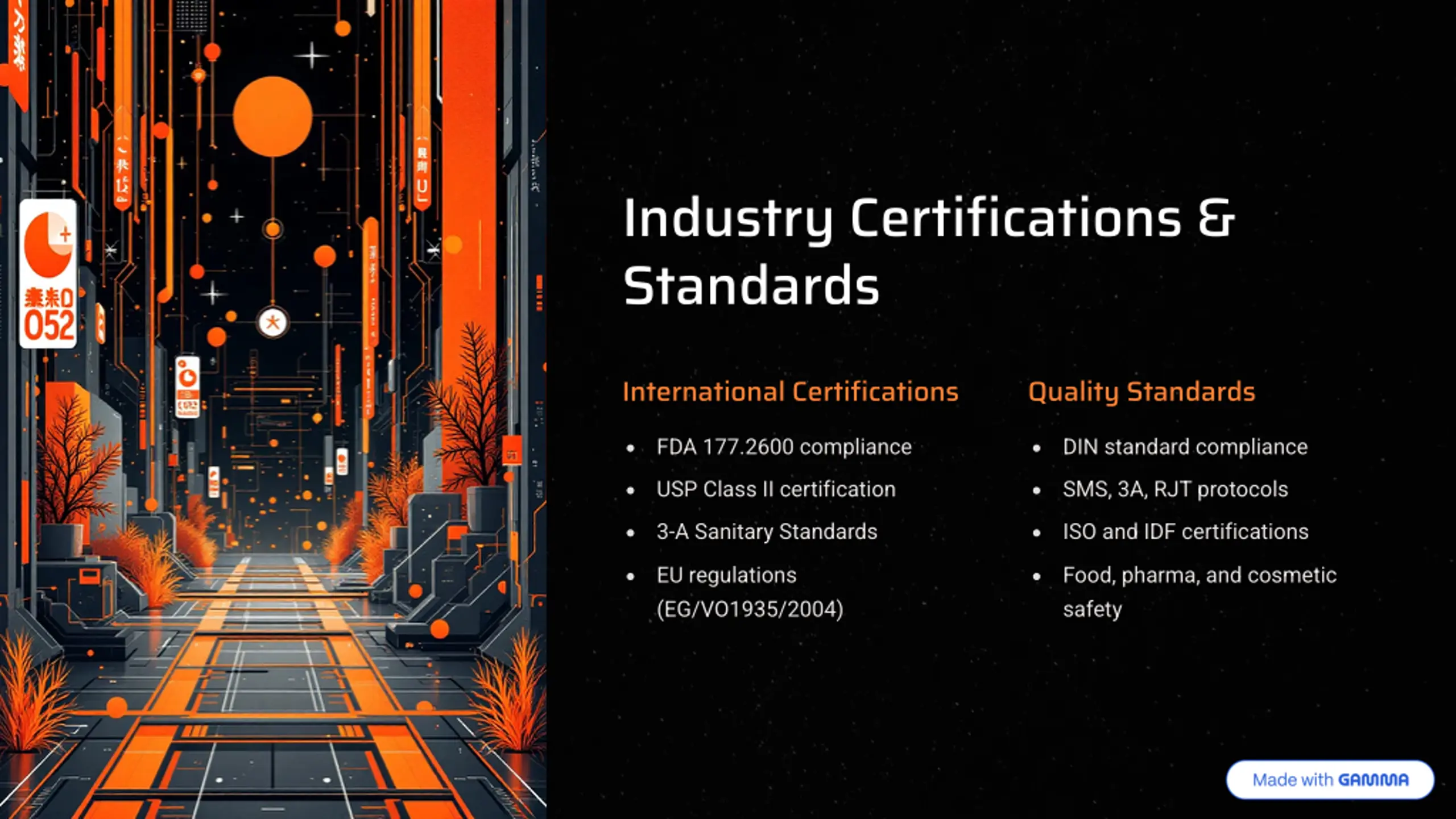 Industry Certifications & Standards International Certifications ?uality Standards FDA 177.2600 compliance DIN standard compliance USP Class II certification SMS, 3A, RJT protocols 3-A Sanitary Standards ISO and IDF certifications EU regulations (EG/VO1935/2004) Food, pharma, and cosmetic safety