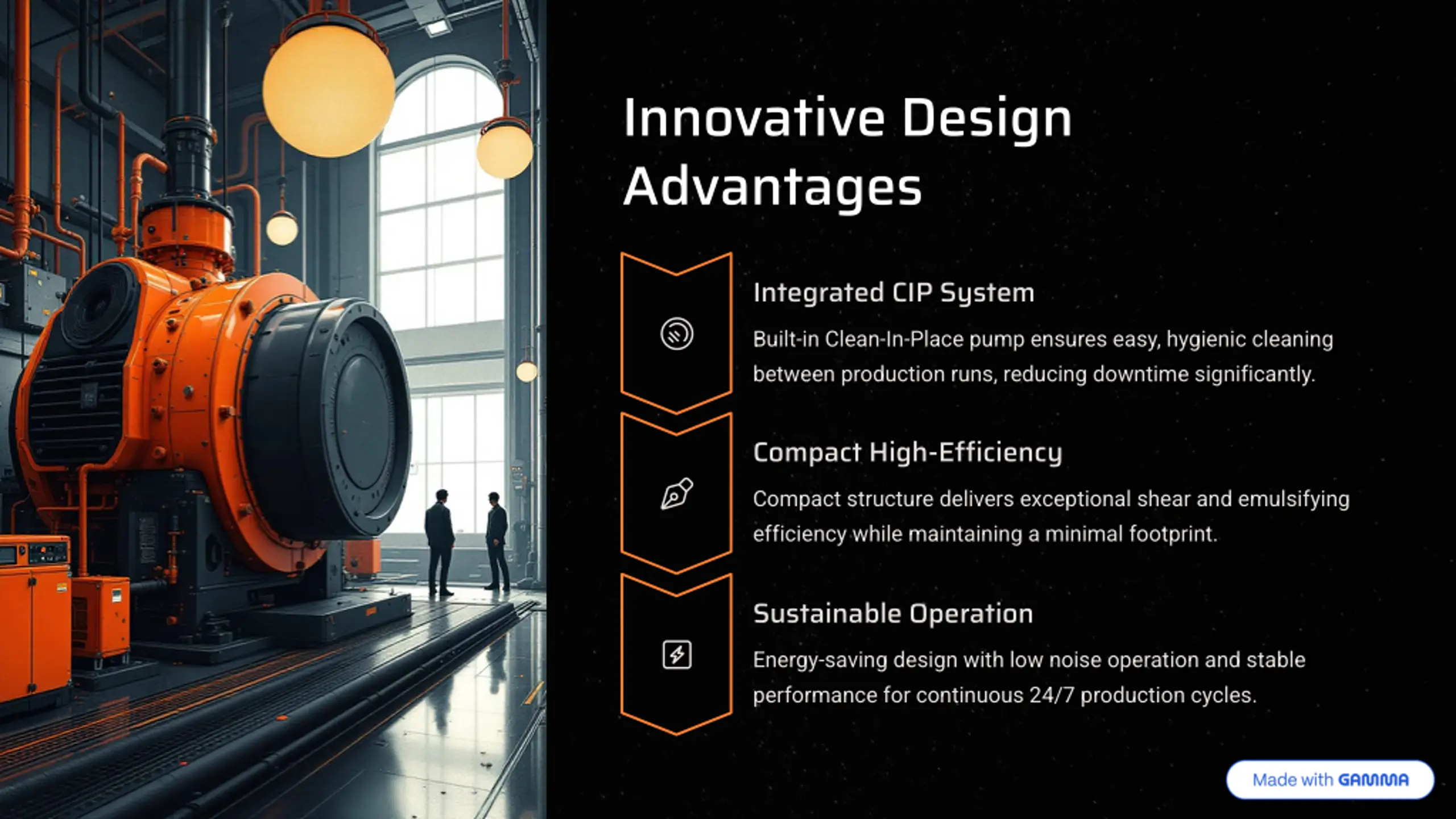 Innovative Design Advantages Integrated CIP System Built-in Clean-In-Place pump ensures easy, hygienic cleaning between production runs, reducing downtime significantly. Compact High-Efficiency Compact structure delivers exceptional shear and emulsifying efficiency while maintaining a minimal footprint. Sustainable Operation Energy-saving design with low noise operation and stable performance for continuous 24/7 production cycles.