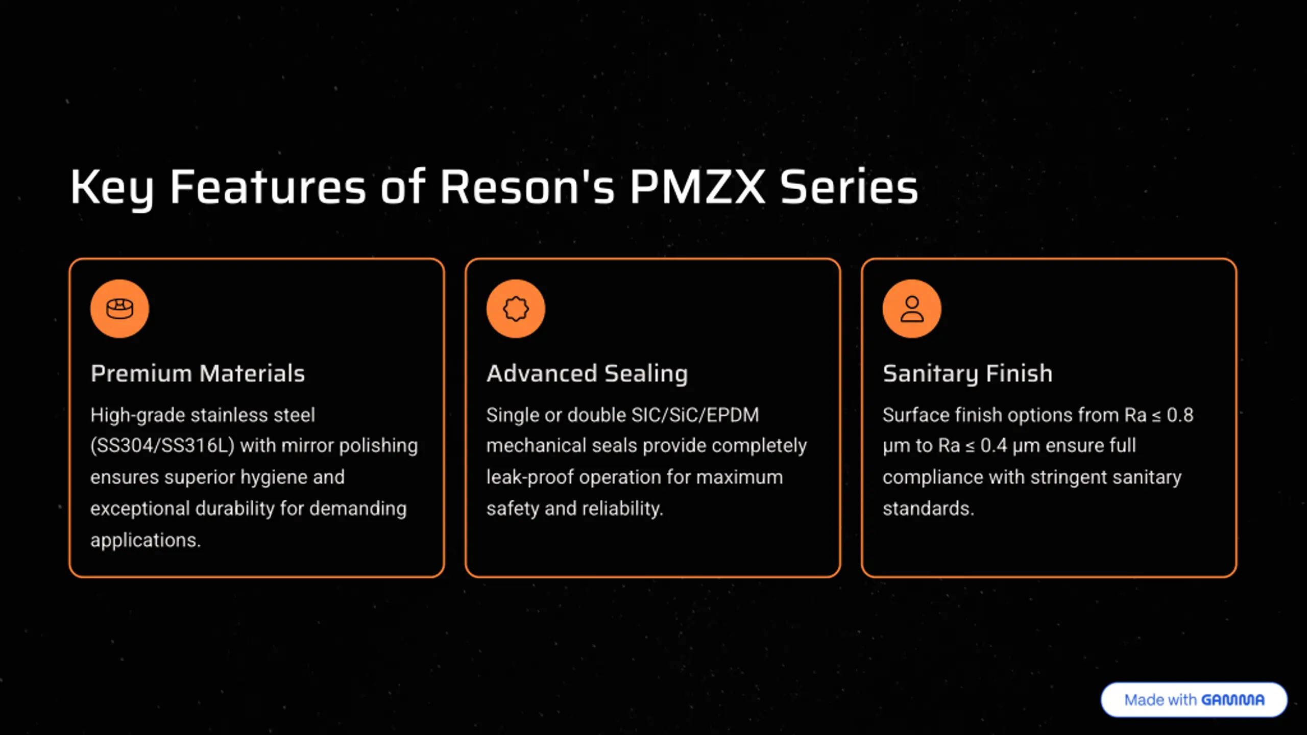 Key Features of Reson's PMZX Series Premium Materials Advanced Sealing Sanitary Finish High-grade stainless steel (SS304/SS316L) with mirror polishing ensures superior hygiene and exceptional durability for demanding applications. Single or double SIC/SiC/EPDM mechanical seals provide completely leak-proof operation for maximum safety and reliability. Surface finish options from Ra f 0.8 m to Ra f 0.4 m ensure full compliance with stringent sanitary standards.