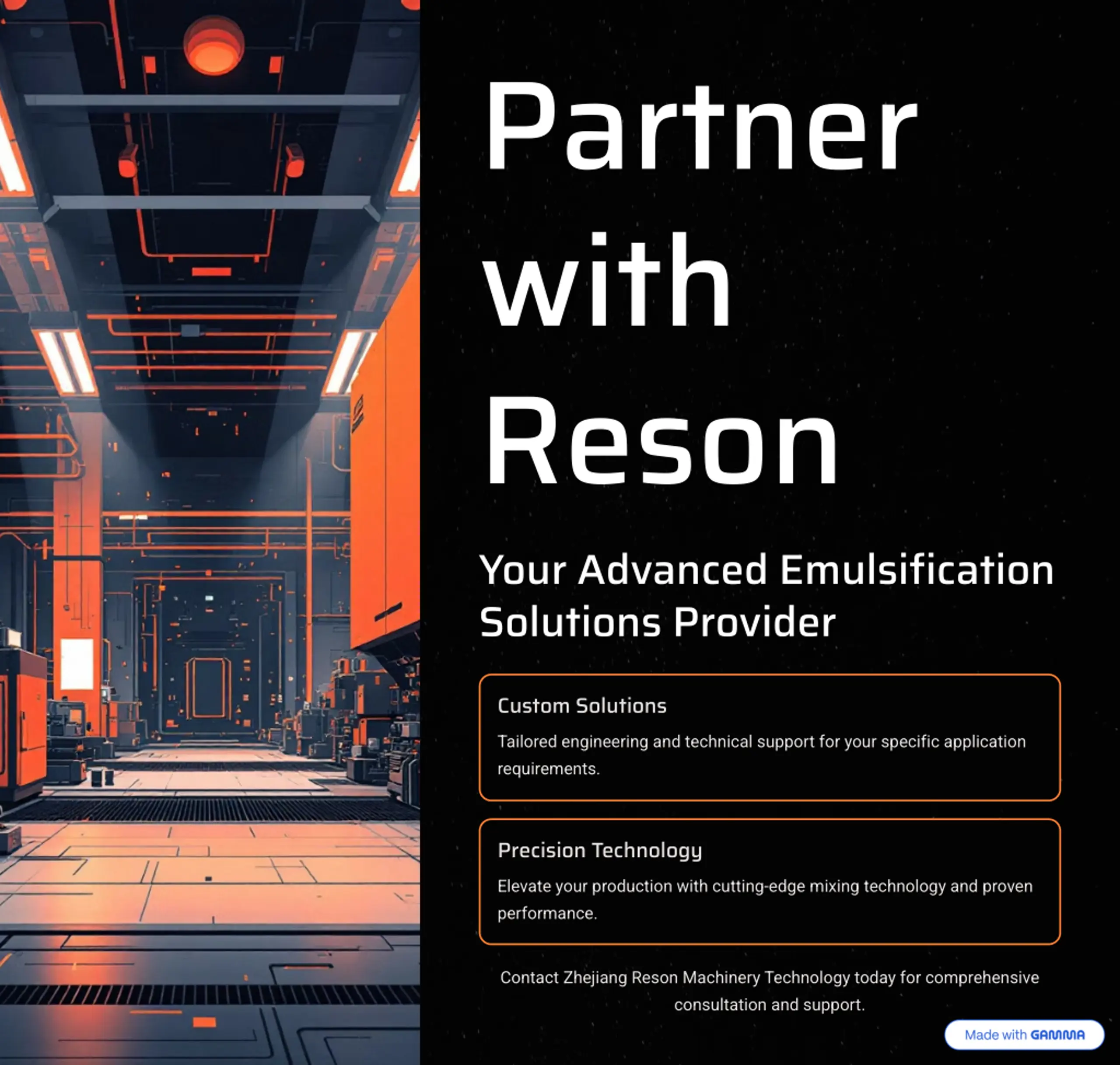 Partner with Reson Your Advanced Emulsification Solutions Provider Custom Solutions Tailored engineering and technical support for your specific application requirements. Precision Technology Elevate your production with cutting-edge mixing technology and proven performance. Contact Zhejiang Reson Machinery Technology today for comprehensive consultation and support.