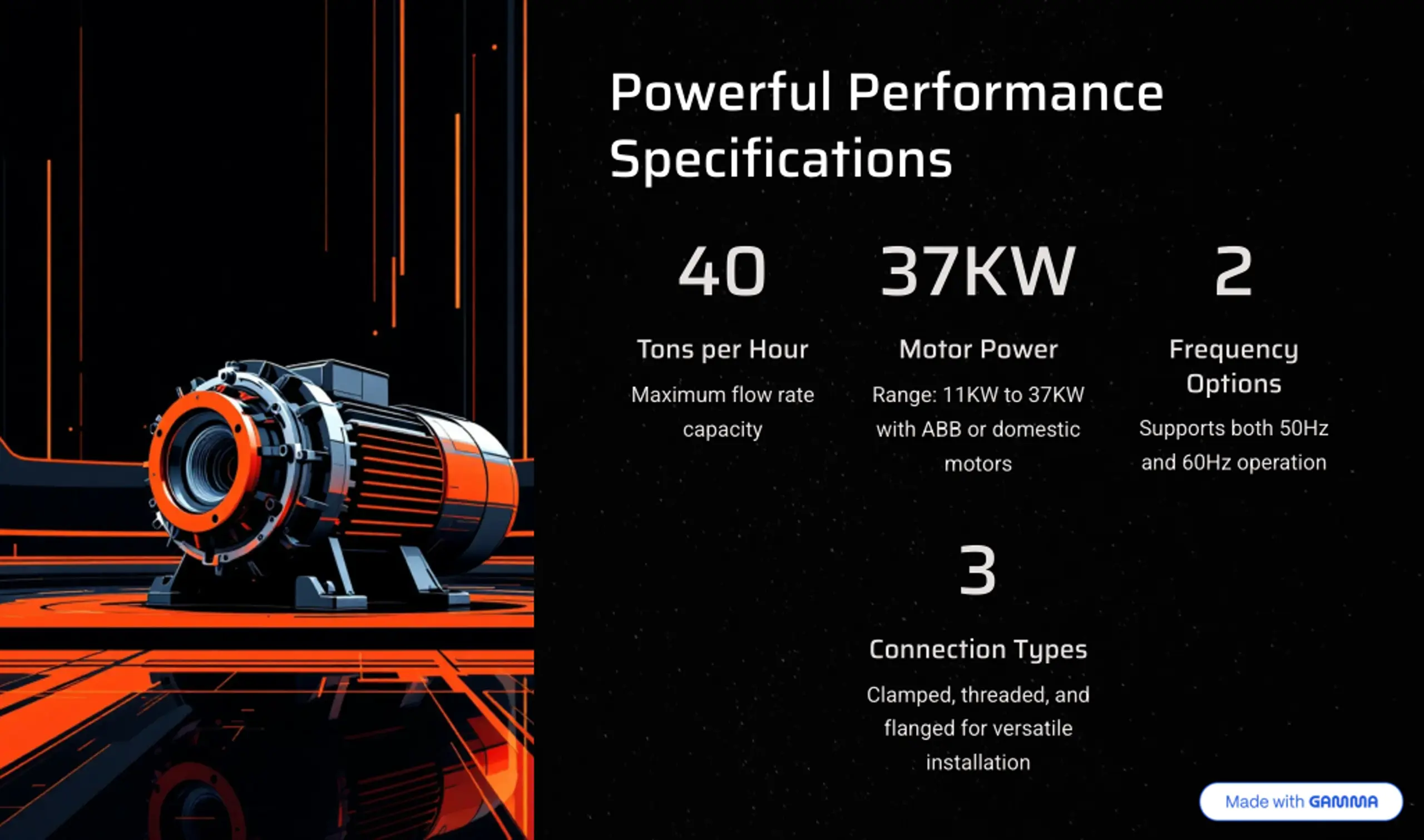 Powerful Performance Specifications 40 Tons per Hour 37KW Motor Power 2 Frequency Options Maximum flow rate capacity Range: 11KW to 37KW with ABB or domestic motors Supports both 50Hz and 60Hz operation 3 Connection Types Clamped, threaded, and flanged for versatile installation