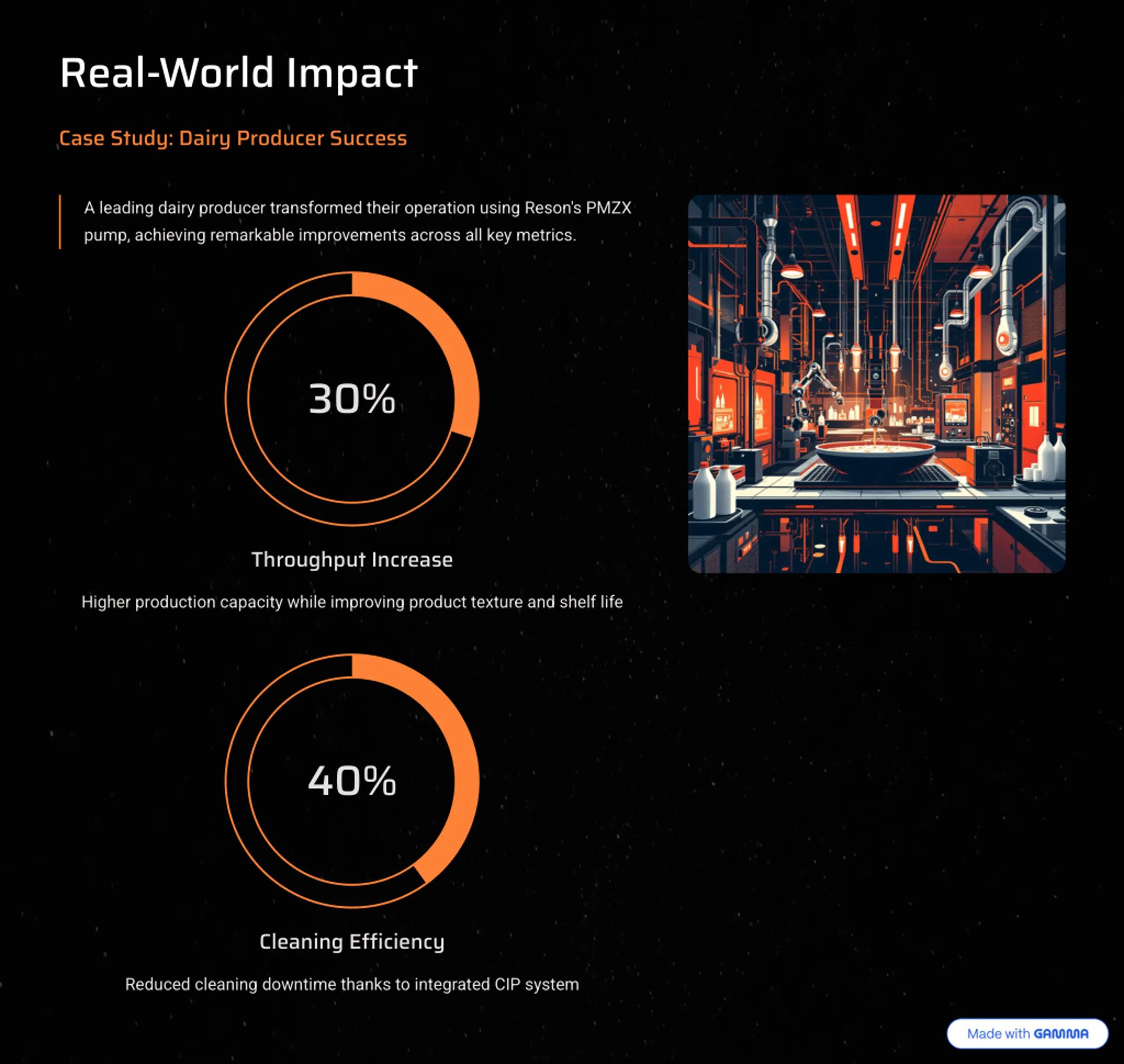 Real-World Impact Case Study: Dairy Producer Success A leading dairy producer transformed their operation using Reson's PMZX pump, achieving remarkable improvements across all key metrics. 30% Throughput Increase Higher production capacity while improving product texture and shelf life 40% Cleaning Efficiency Reduced cleaning downtime thanks to integrated CIP system