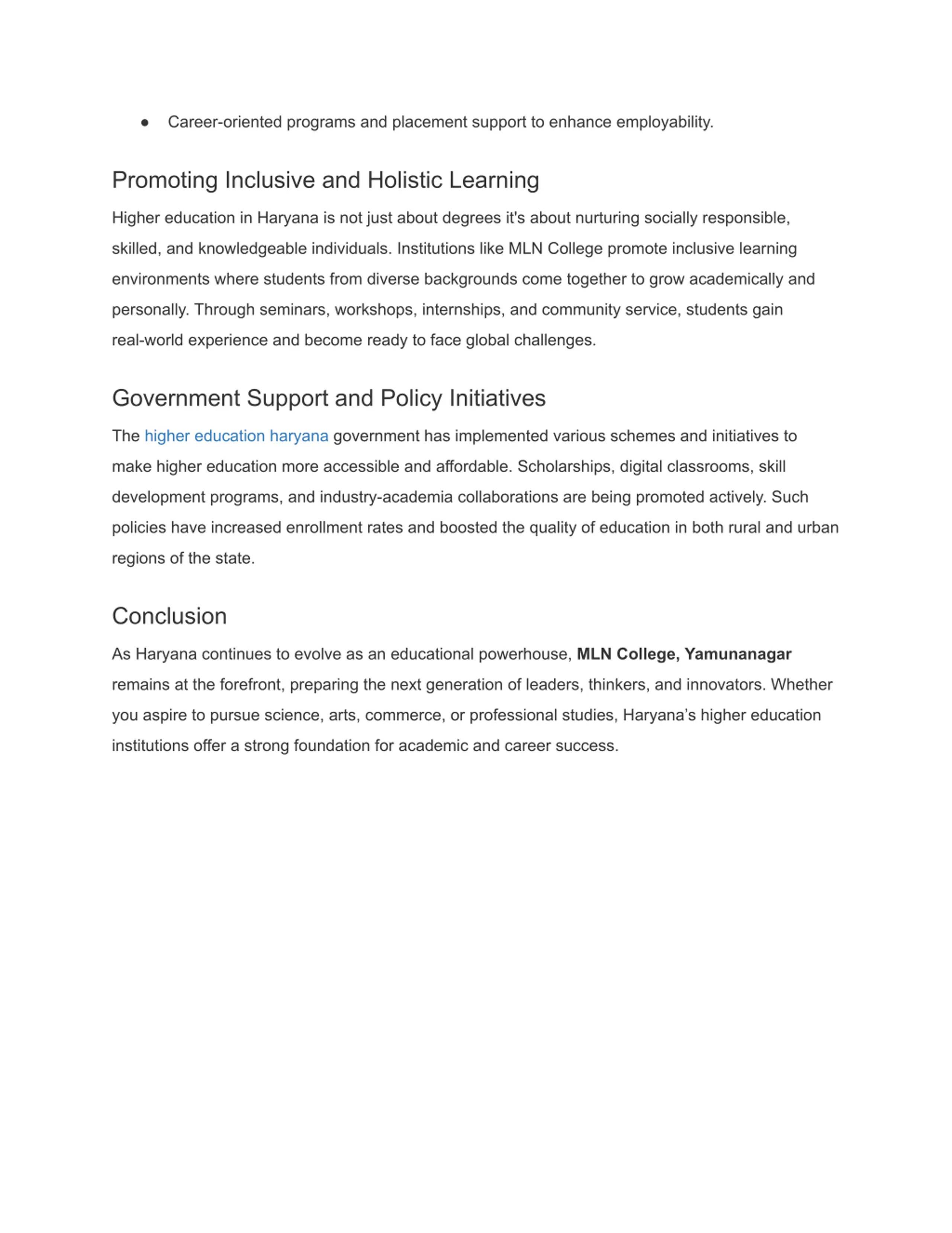 Career-oriented programs and placement support to enhance employability. Promoting Inclusive and Holistic Learning Higher education in Haryana is not just about degrees it's about nurturing socially responsible, skilled, and knowledgeable individuals. Institutions like MLN College promote inclusive learning environments where students from diverse backgrounds come together to grow academically and personally. Through seminars, workshops, internships, and community service, students gain real-world experience and become ready to face global challenges. Government Support and Policy Initiatives The higher education haryana government has implemented various schemes and initiatives to make higher education more accessible and affordable. Scholarships, digital classrooms, skill development programs, and industry-academia collaborations are being promoted actively. Such policies have increased enrollment rates and boosted the quality of education in both rural and urban regions of the state. Conclusion As Haryana continues to evolve as an educational powerhouse, MLN College, Yamunanagar remains at the forefront, preparing the next generation of leaders, thinkers, and innovators. Whether you aspire to pursue science, arts, commerce, or professional studies, Haryana s higher education institutions offer a strong foundation for academic and career success.