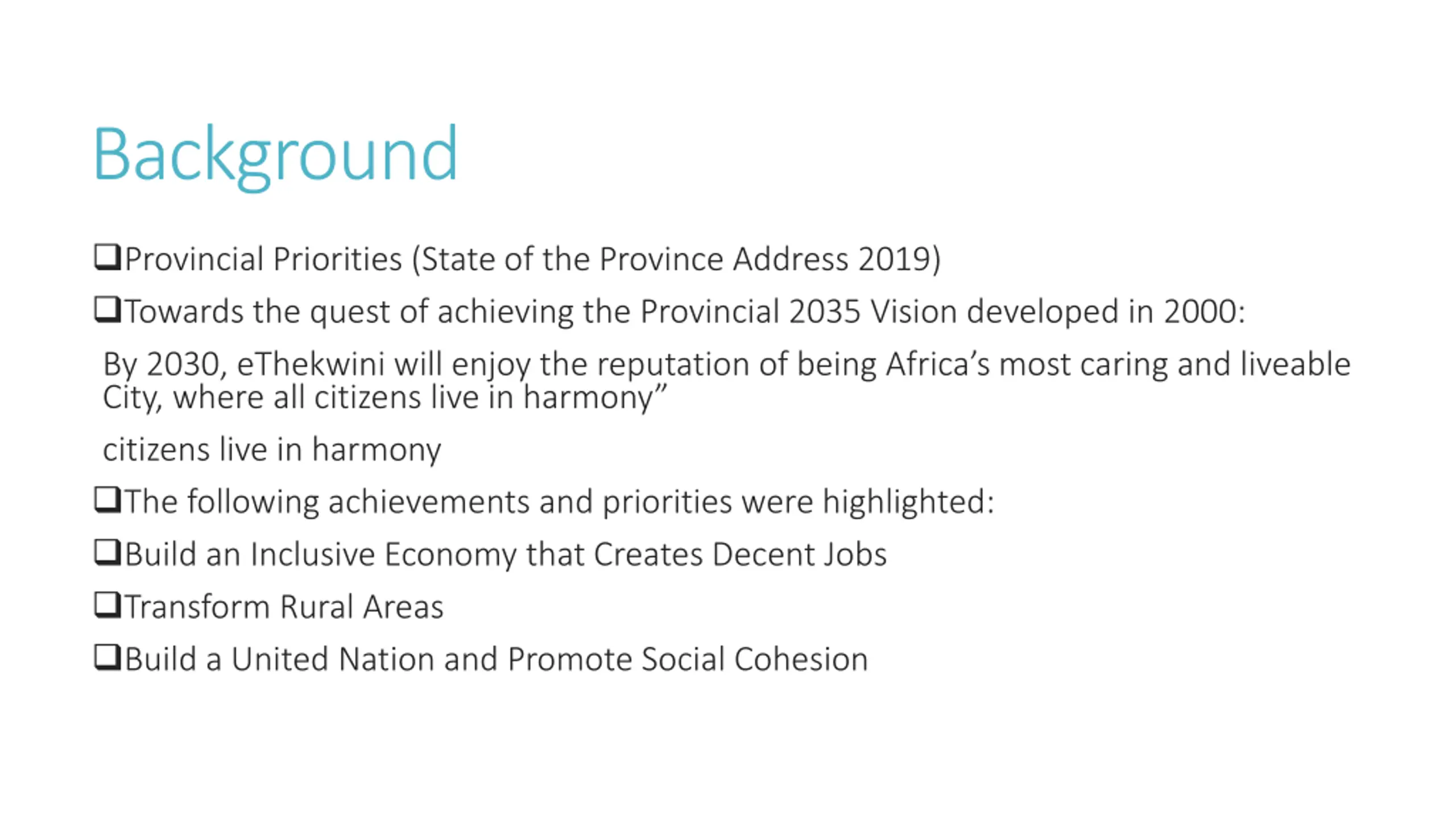 Background Provincial Priorities (State of the Province Address 2019) Towards the quest of achieving the Provincial 2035 Vision developed in 2000: By 2030, eThekwini will enjoy the reputation of being Africa s most caring and liveable City, where all citizens live in harmony citizens live in harmony The following achievements and priorities were highlighted: Build an Inclusive Economy that Creates Decent Jobs Transform Rural Areas Build a United Nation and Promote Social Cohesion