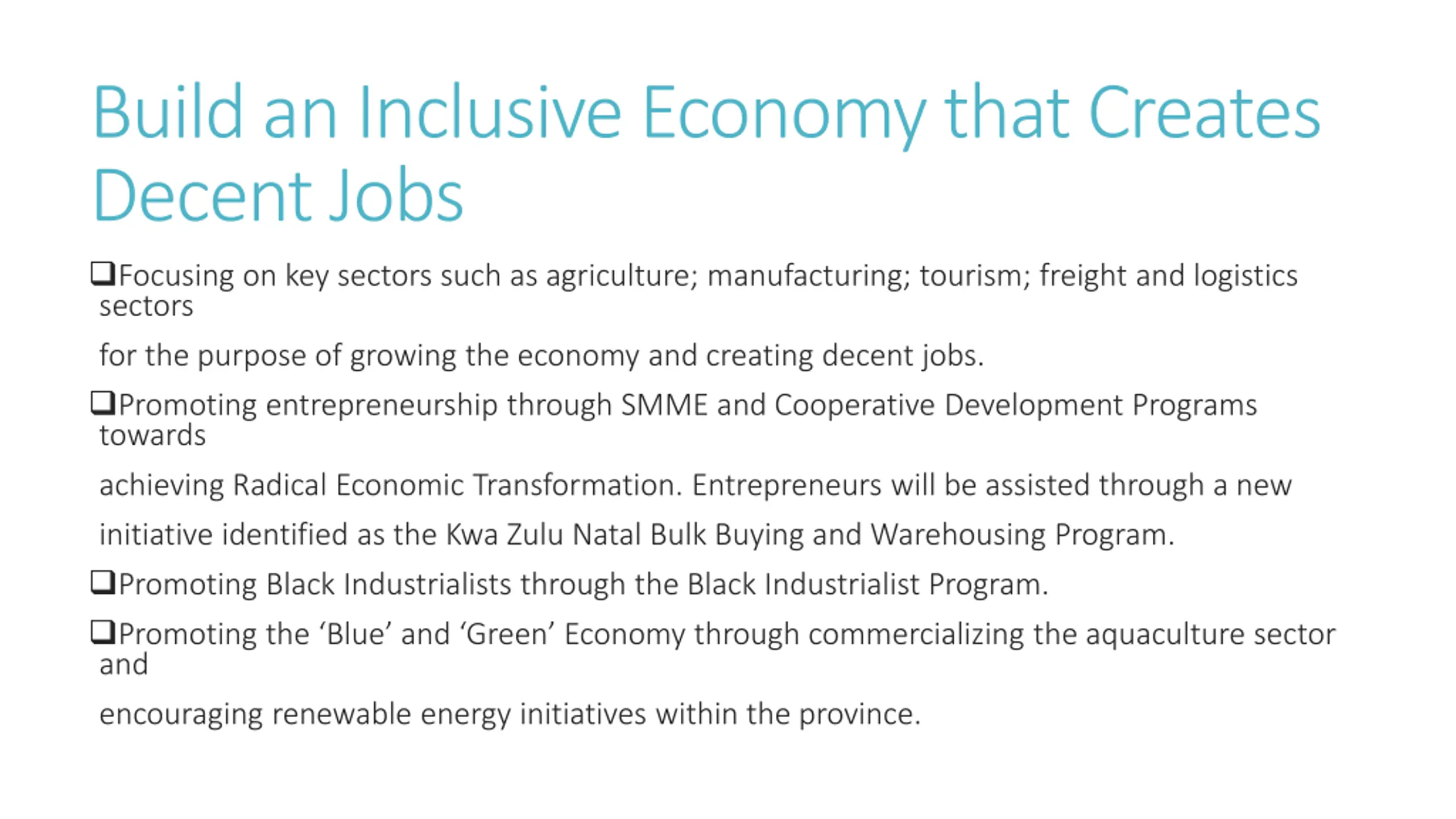 Build an Inclusive Economy that Creates Decent Jobs Focusing on key sectors such as agriculture; manufacturing; tourism; freight and logistics sectors for the purpose of growing the economy and creating decent jobs. Promoting entrepreneurship through SMME and Cooperative Development Programs towards achieving Radical Economic Transformation. Entrepreneurs will be assisted through a new initiative identified as the Kwa Zulu Natal Bulk Buying and Warehousing Program. Promoting Black Industrialists through the Black Industrialist Program. Promoting the Blue and Green Economy through commercializing the aquaculture sector and encouraging renewable energy initiatives within the province.