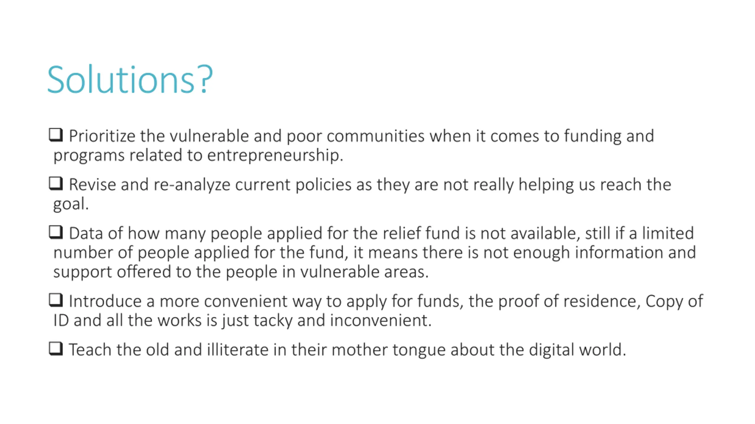 Solutions? Prioritize the vulnerable and poor communities when it comes to funding and programs related to entrepreneurship. Revise and re-analyze current policies as they are not really helping us reach the goal. Data of how many people applied for the relief fund is not available, still if a limited number of people applied for the fund, it means there is not enough information and support offered to the people in vulnerable areas. Introduce a more convenient way to apply for funds, the proof of residence, Copy of ID and all the works is just tacky and inconvenient. Teach the old and illiterate in their mother tongue about the digital world.