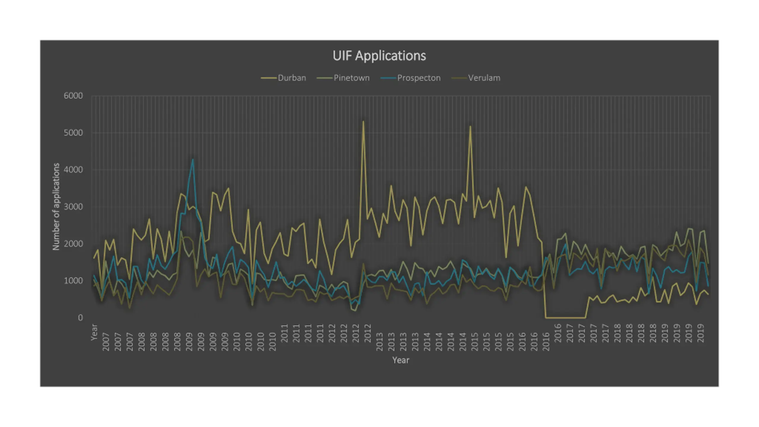 UIF Applications UIF Applications Durban Pinetown Prospecton Verulam 6000 5000 Number of applications Number of applications 4000 3000 2000 1000 0 2017 2018 2011 2011 2011 2011 2012 2012 2012 2012 2016 2017 2017 2017 2018 2018 2018 2019 2019 2019 2019 Year 2007 2009 2007 2007 2008 2008 2008 2008 2009 2009 2009 2010 2010 2010 2010 2013 2013 2013 2013 2014 2014 2014 2014 2015 2015 2015 2015 2016 2016 2016 Year Year