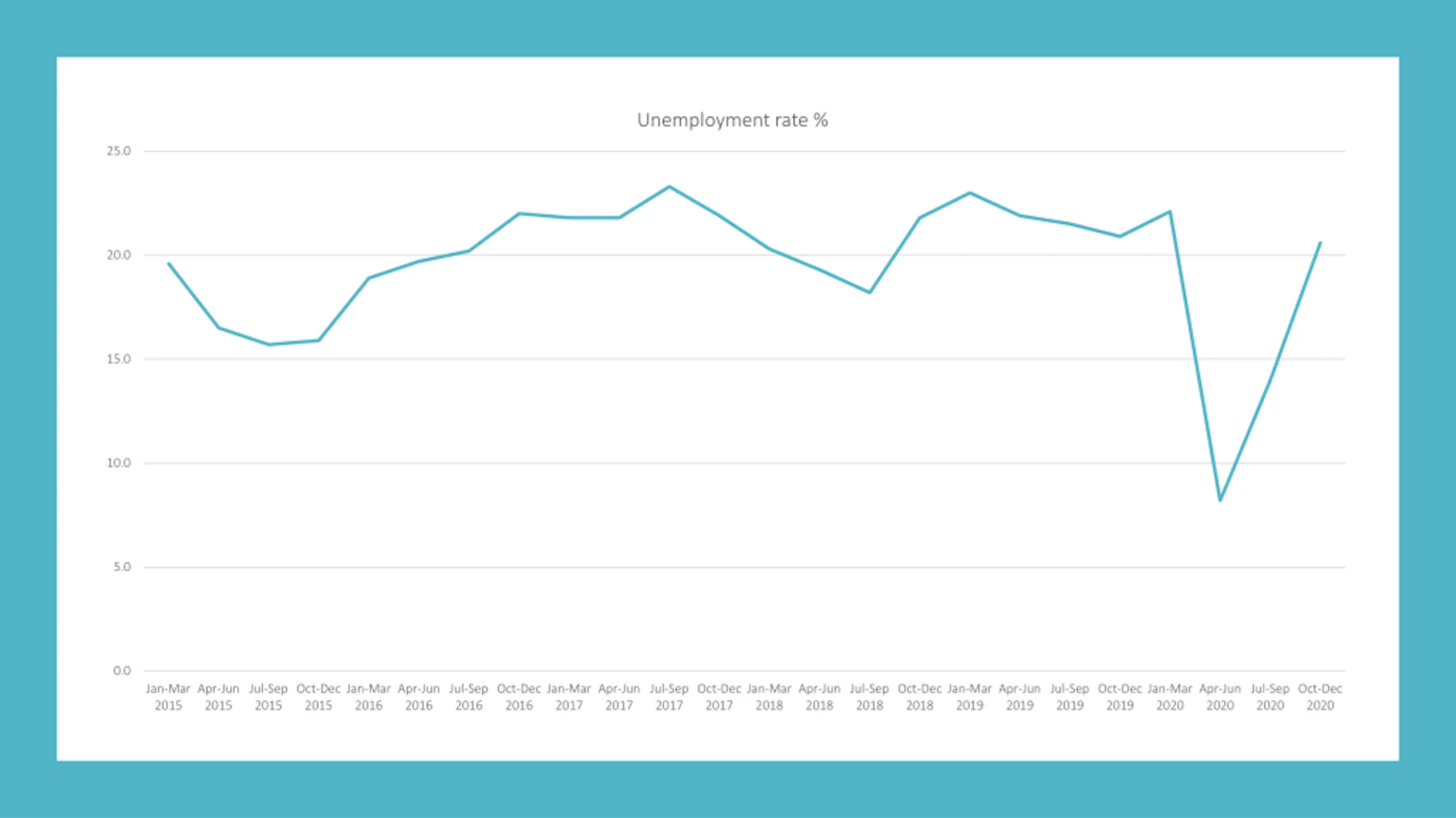Unemployment rate % 25.0 20.0 15.0 10.0 5.0 0.0 Jan-Mar 2015 Apr-Jun 2015 Jul-Sep 2015 Oct-Dec 2015 Jan-Mar 2016 Apr-Jun 2016 Jul-Sep 2016 Oct-Dec 2016 Jan-Mar 2017 Apr-Jun 2017 Jul-Sep 2017 Oct-Dec 2017 Jan-Mar 2018 Apr-Jun 2018 Jul-Sep 2018 Oct-Dec 2018 Jan-Mar 2019 Apr-Jun 2019 Jul-Sep 2019 Oct-Dec 2019 Jan-Mar 2020 Apr-Jun 2020 Jul-Sep 2020 Oct-Dec 2020