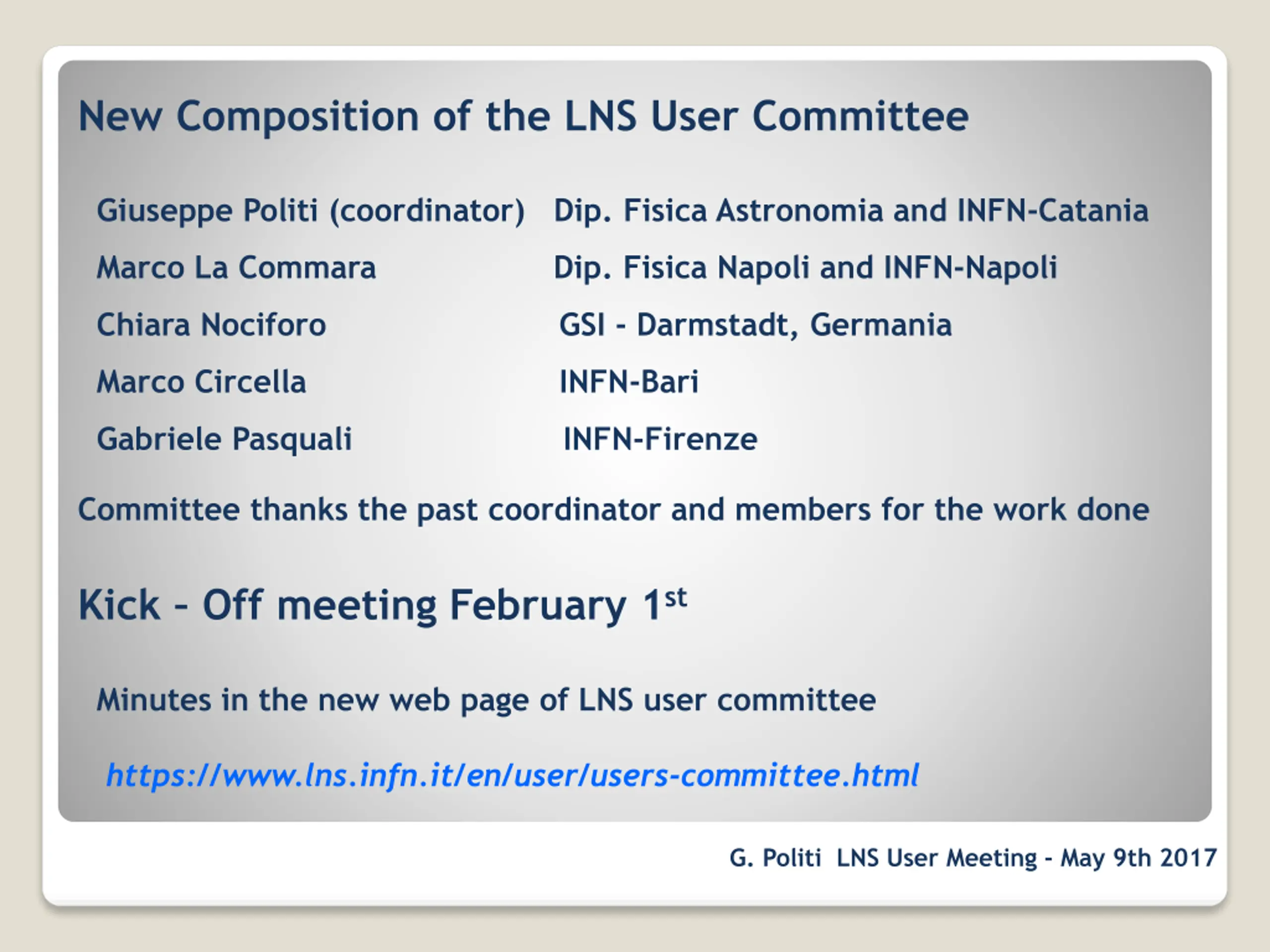 New Composition of the LNS User Committee Giuseppe Politi (coordinator) Dip. Fisica Astronomia and INFN-Catania Marco La Commara Dip. Fisica Napoli and INFN-Napoli Chiara Nociforo GSI - Darmstadt, Germania Marco Circella INFN-Bari Gabriele Pasquali INFN-Firenze Committee thanks the past coordinator and members for the work done Kick Off meeting February 1st Minutes in the new web page of LNS user committee https://www.lns.infn.it/en/user/users-committee.html G. Politi LNS User Meeting - May 9th 2017