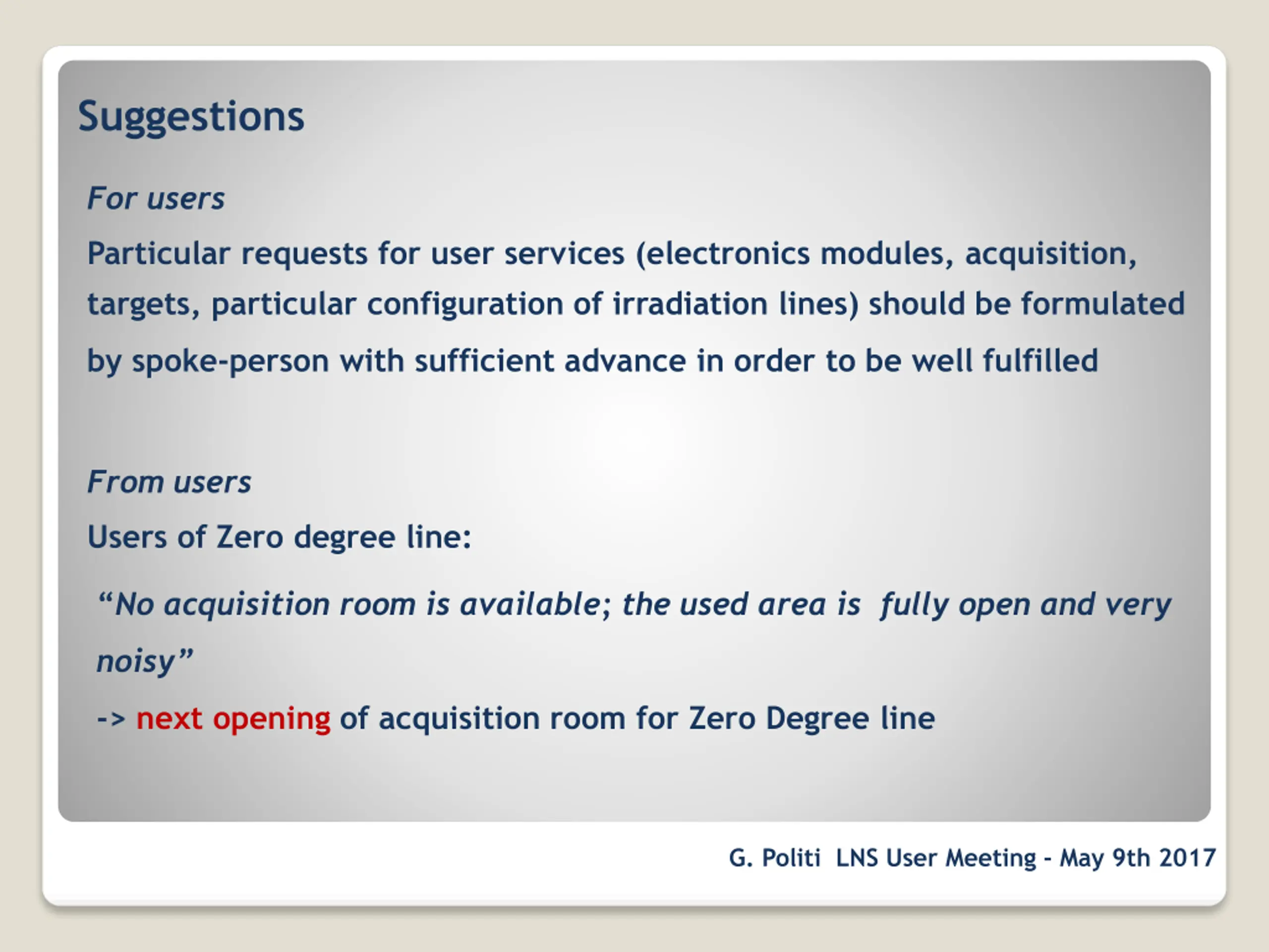 Suggestions For users Particular requests for user services (electronics modules, acquisition, targets, particular configuration of irradiation lines) should be formulated by spoke-person with sufficient advance in order to be well fulfilled From users Users of Zero degree line: No acquisition room is available; the used area is fully open and very noisy -> next opening of acquisition room for Zero Degree line G. Politi LNS User Meeting - May 9th 2017