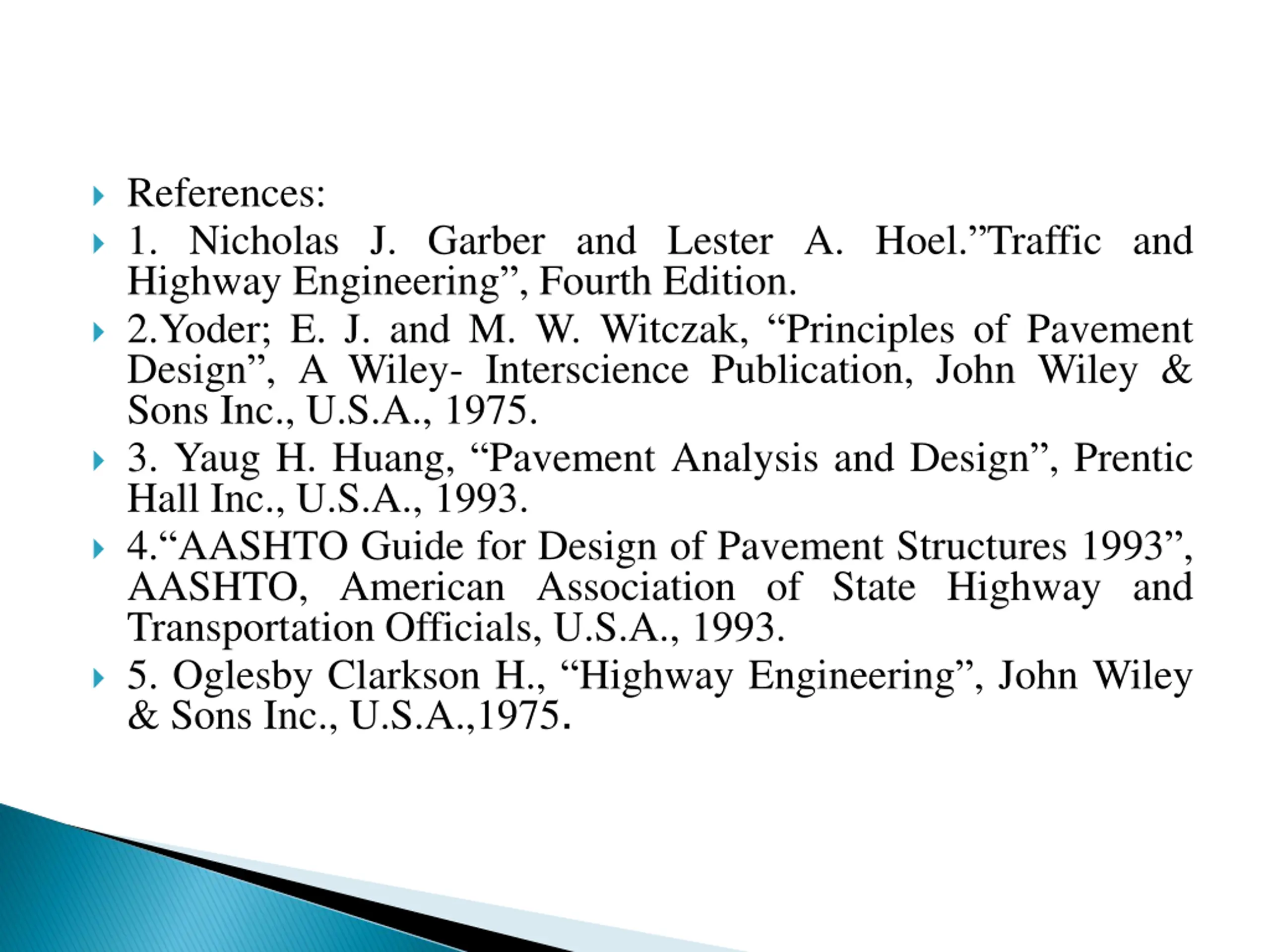 References: 1. Nicholas J. Garber and Lester A. Hoel. Traffic and Highway Engineering , Fourth Edition. 2.Yoder; E. J. and M. W. Witczak, Principles of Pavement Design , A Wiley- Interscience Publication, John Wiley & Sons Inc., U.S.A., 1975. 3. Yaug H. Huang, Pavement Analysis and Design , Prentic Hall Inc., U.S.A., 1993. 4. AASHTO Guide for Design of Pavement Structures 1993 , AASHTO, American Association of State Highway and Transportation Officials, U.S.A., 1993. 5. Oglesby Clarkson H., Highway Engineering , John Wiley & Sons Inc., U.S.A.,1975.
