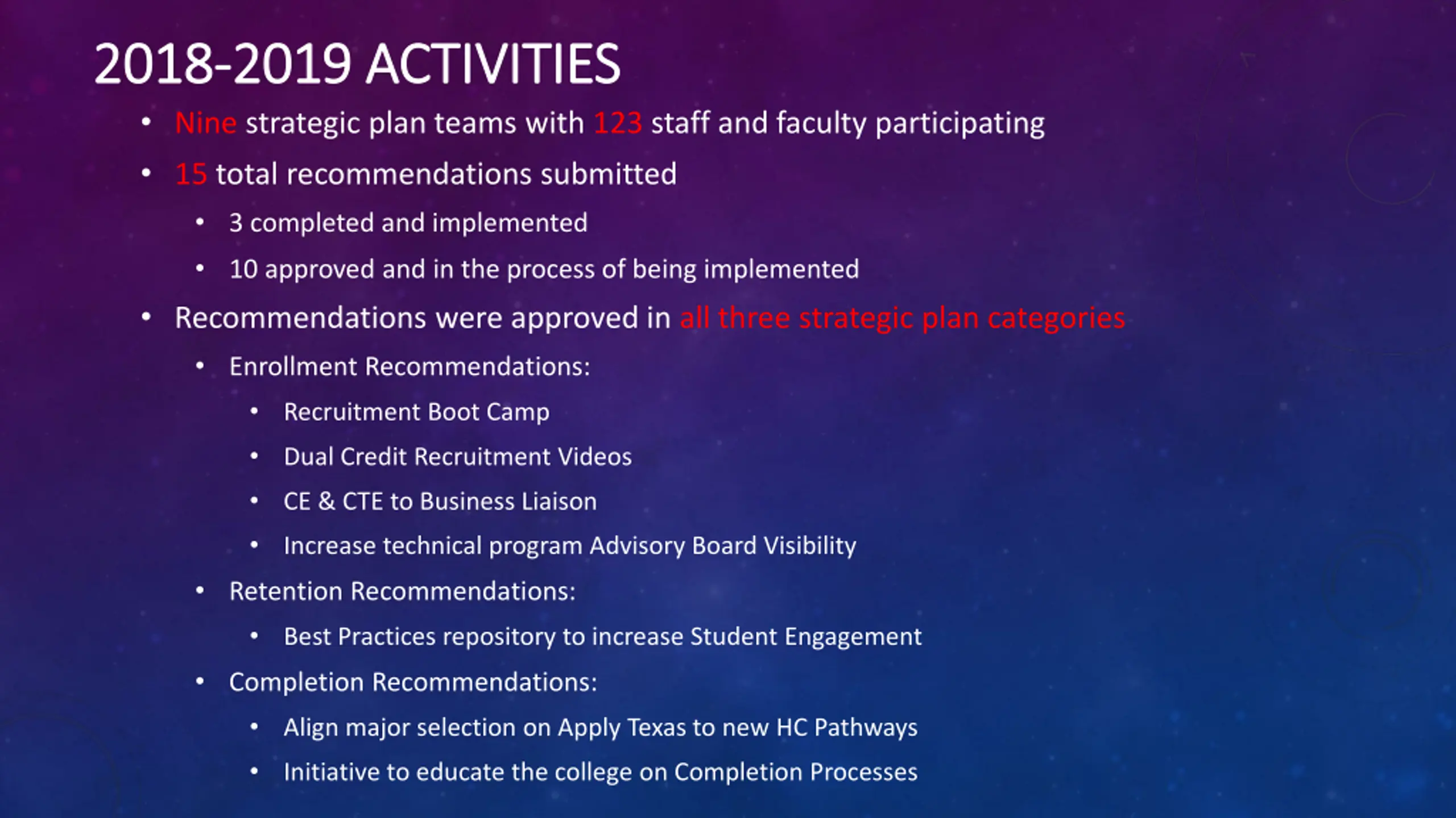 2018 2018- -2019 ACTIVITIES 2019 ACTIVITIES Nine strategic plan teams with 123 staff and faculty participating 15 total recommendations submitted 3 completed and implemented 10 approved and in the process of being implemented Recommendations were approved in all three strategic plan categories Enrollment Recommendations: Recruitment Boot Camp Dual Credit Recruitment Videos CE & CTE to Business Liaison Increase technical program Advisory Board Visibility Retention Recommendations: Best Practices repository to increase Student Engagement Completion Recommendations: Align major selection on Apply Texas to new HC Pathways Initiative to educate the college on Completion Processes