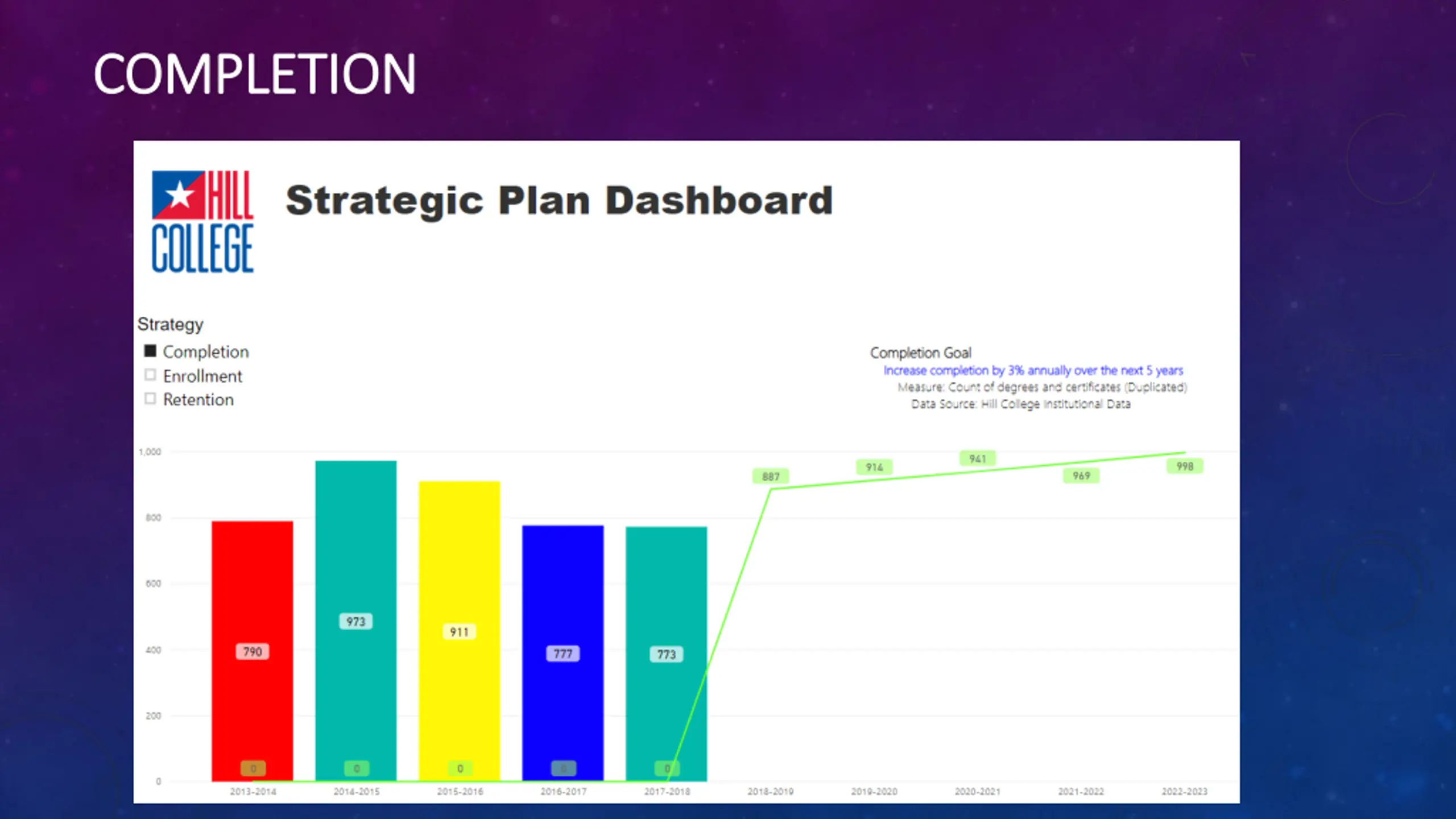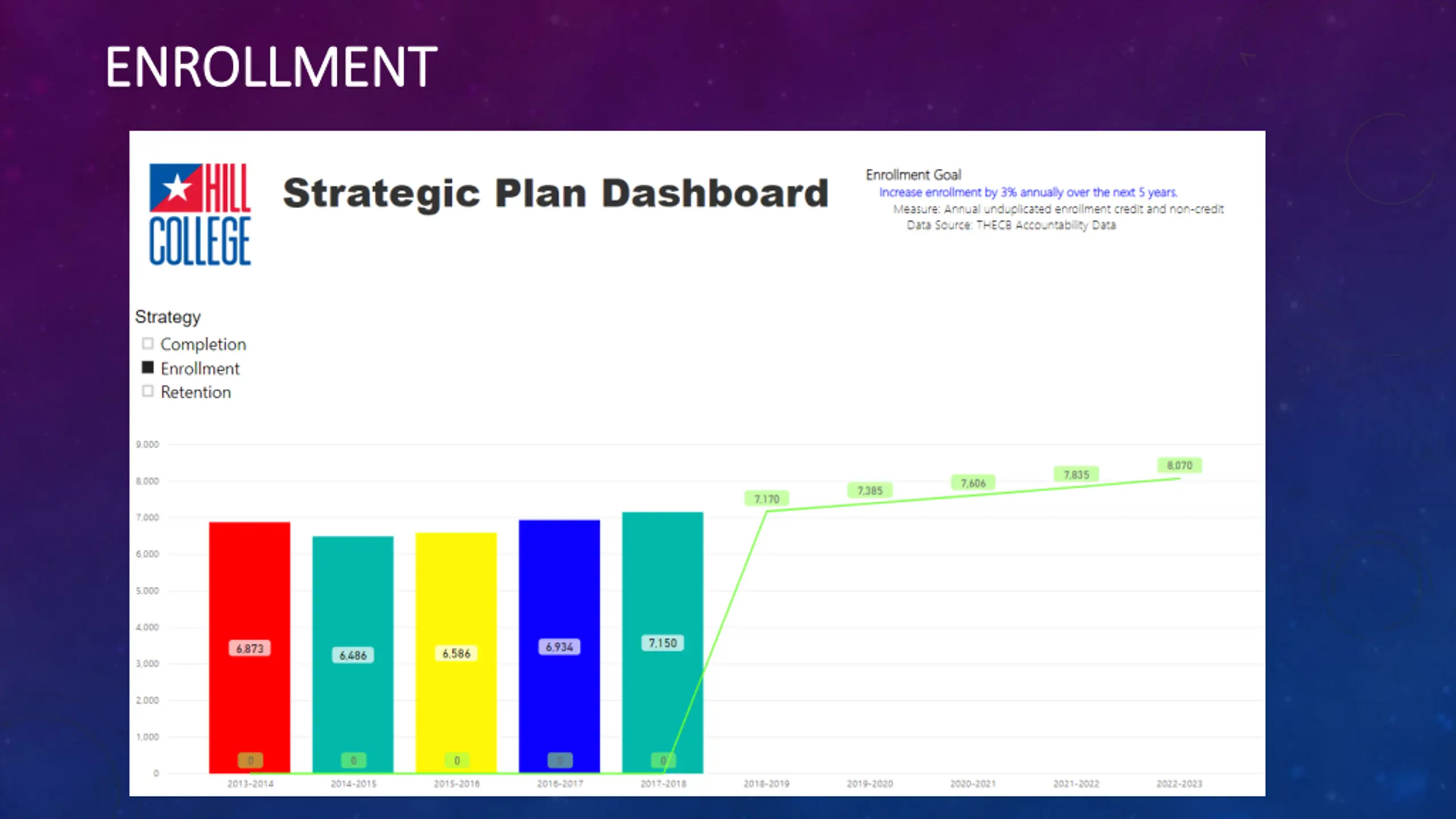 "Explore the latest updates from Hill College's strategic plan, focusing on enrollment growth, retention strategies, and completion targets. Get insights into key recommendations and activities undertaken to enhance student experiences. Discover the roadmap for the future as outlined in the committee retreat recommendations for the upcoming academic year."