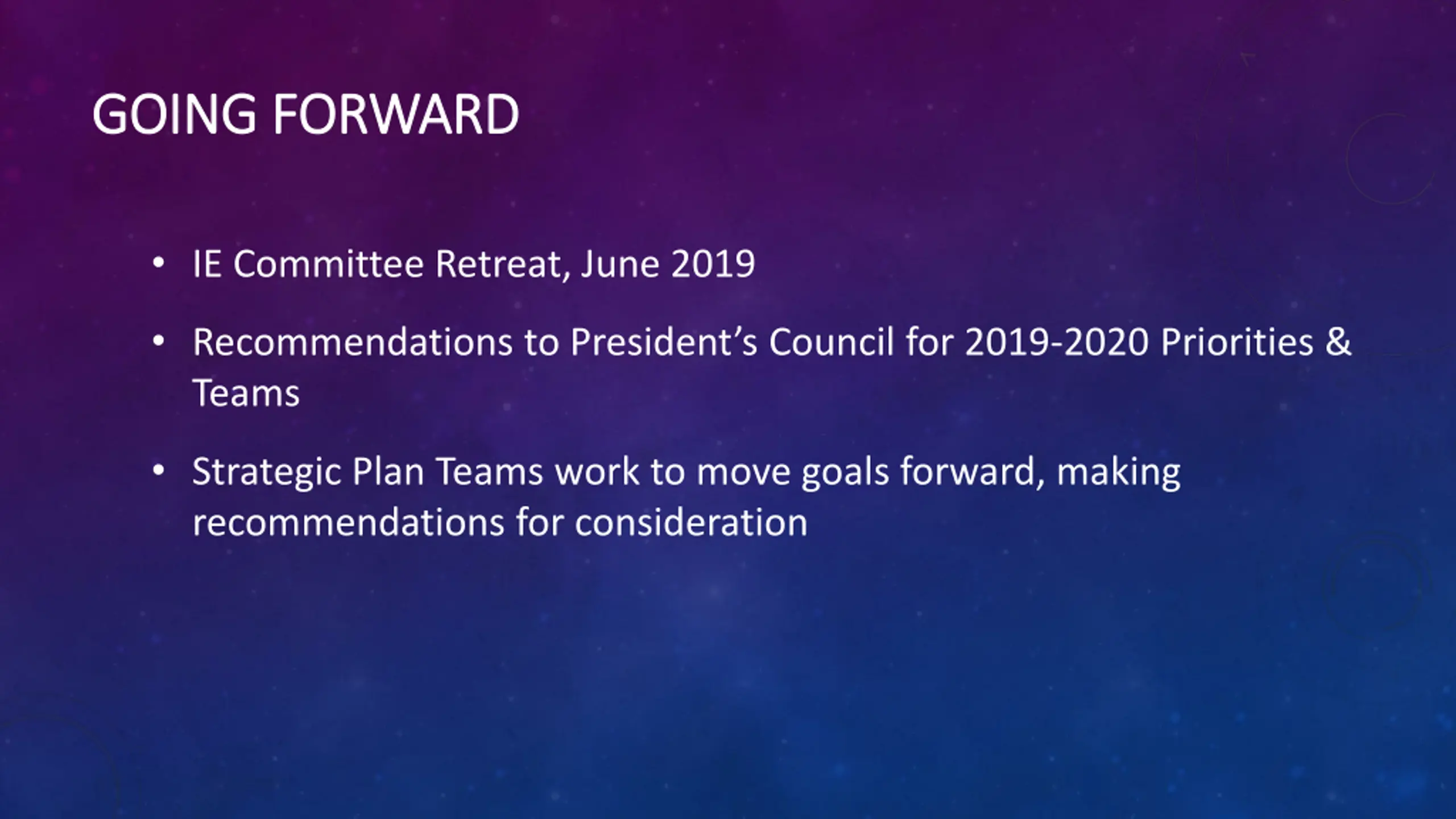 GOING FORWARD GOING FORWARD IE Committee Retreat, June 2019 Recommendations to President s Council for 2019-2020 Priorities & Teams Strategic Plan Teams work to move goals forward, making recommendations for consideration