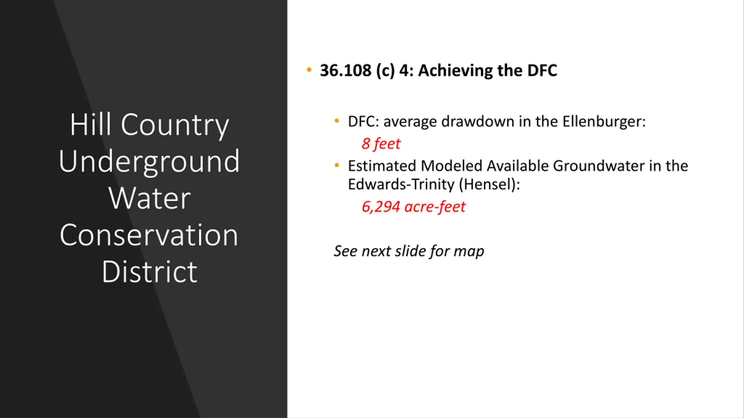 36.108 (c) 4: Achieving the DFC DFC: average drawdown in the Edwards-Trinity (Hensel): 5 feet Estimated Modeled Available Groundwater in the Edwards-Trinity (Hensel): 4,979 acre-feet Hill Country Underground Water Conservation District See next slide for map