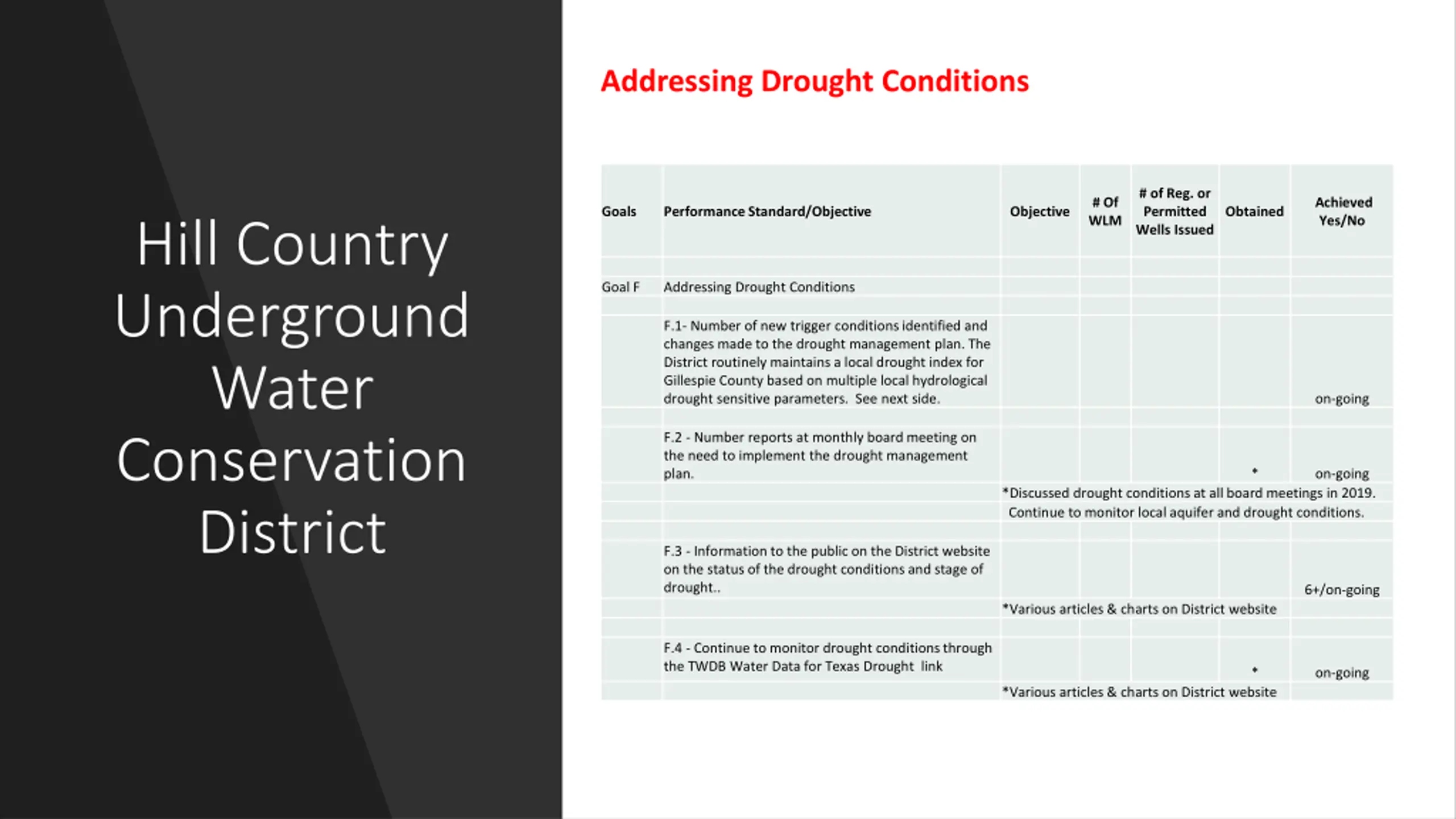 Addressing Drought Conditions # of Reg. or Permitted Wells Issued # Of WLM Achieved Yes/No Goals Performance Standard/Objective Objective Obtained Hill Country Underground Water Conservation District Goal F Addressing Drought Conditions F.1- Number of new trigger conditions identified and changes made to the drought management plan. The District routinely maintains a local drought index for Gillespie County based on multiple local hydrological drought sensitive parameters. See next side. on-going F.2 - Number reports at monthly board meeting on the need to implement the drought management plan. * on-going *Discussed drought conditions at all board meetings in 2019. Continue to monitor local aquifer and drought conditions. F.3 - Information to the public on the District website on the status of the drought conditions and stage of drought.. 6+/on-going *Various articles & charts on District website F.4 - Continue to monitor drought conditions through the TWDB Water Data for Texas Drought link * on-going *Various articles & charts on District website