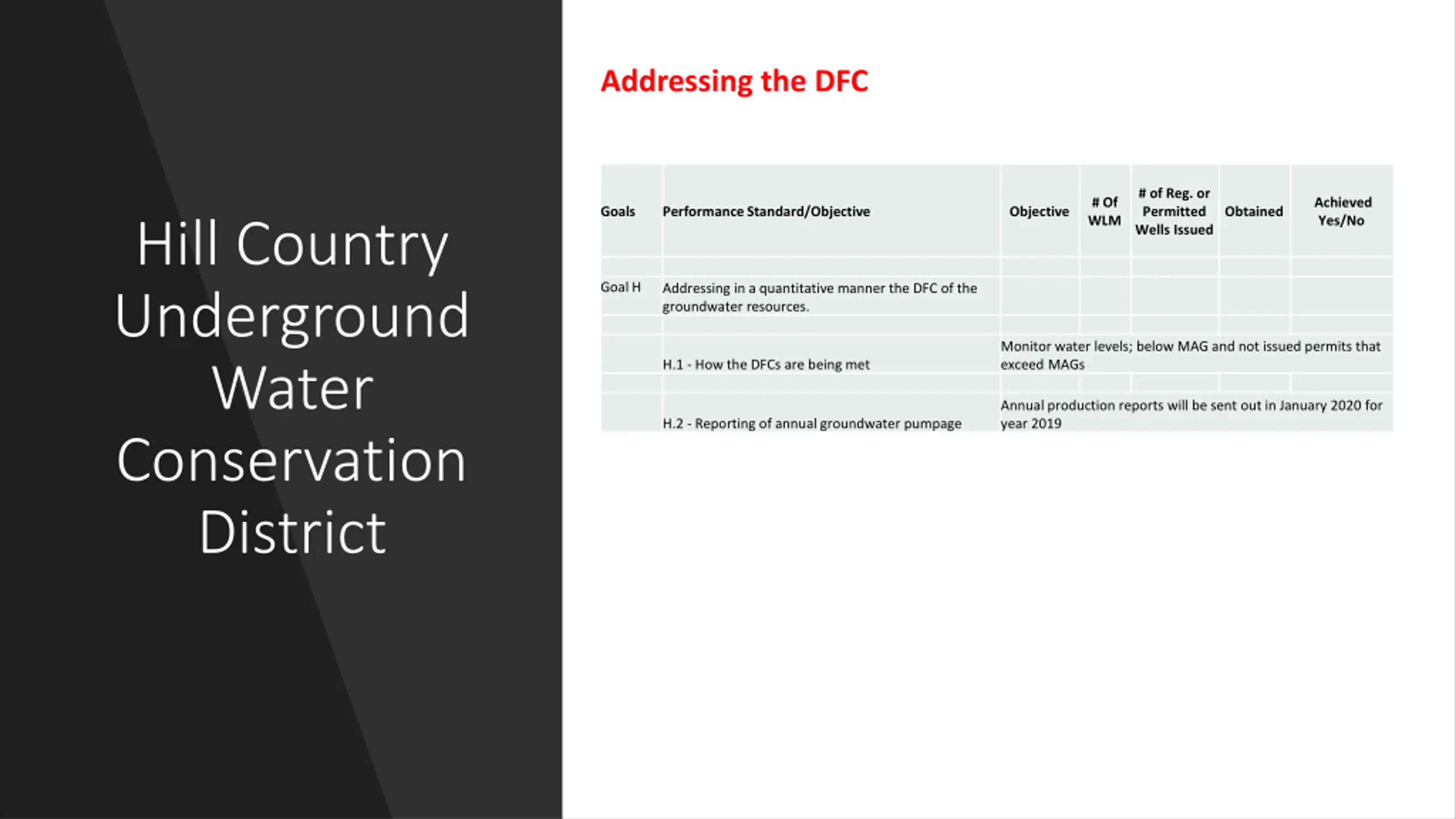 Addressing the DFC # of Reg. or Permitted Wells Issued # Of WLM Achieved Yes/No Goals Performance Standard/Objective Objective Obtained Hill Country Underground Water Conservation District Goal H Addressing in a quantitative manner the DFC of the groundwater resources. Monitor water levels; below MAG and not issued permits that exceed MAGs H.1 - How the DFCs are being met Annual production reports will be sent out in January 2020 for year 2019 H.2 - Reporting of annual groundwater pumpage