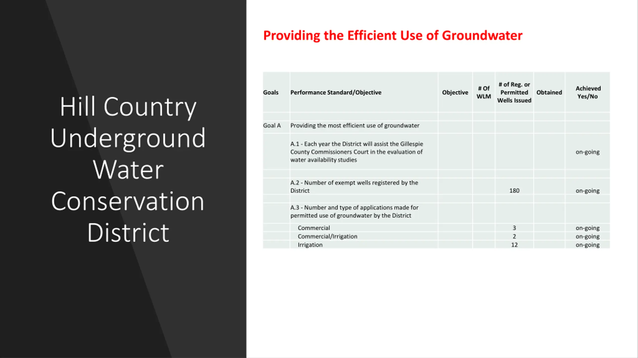 Providing the Efficient Use of Groundwater # of Reg. or Permitted Wells Issued # Of WLM Achieved Yes/No Goals Performance Standard/Objective Objective Obtained Hill Country Underground Water Conservation District Goal A Providing the most efficient use of groundwater A.1 - Each year the District will assist the Gillespie County Commissioners Court in the evaluation of water availability studies on-going A.2 - Number of exempt wells registered by the District 180 on-going A.3 - Number and type of applications made for permitted use of groundwater by the District 3 2 12 on-going on-going on-going Commercial Commercial/Irrigation Irrigation