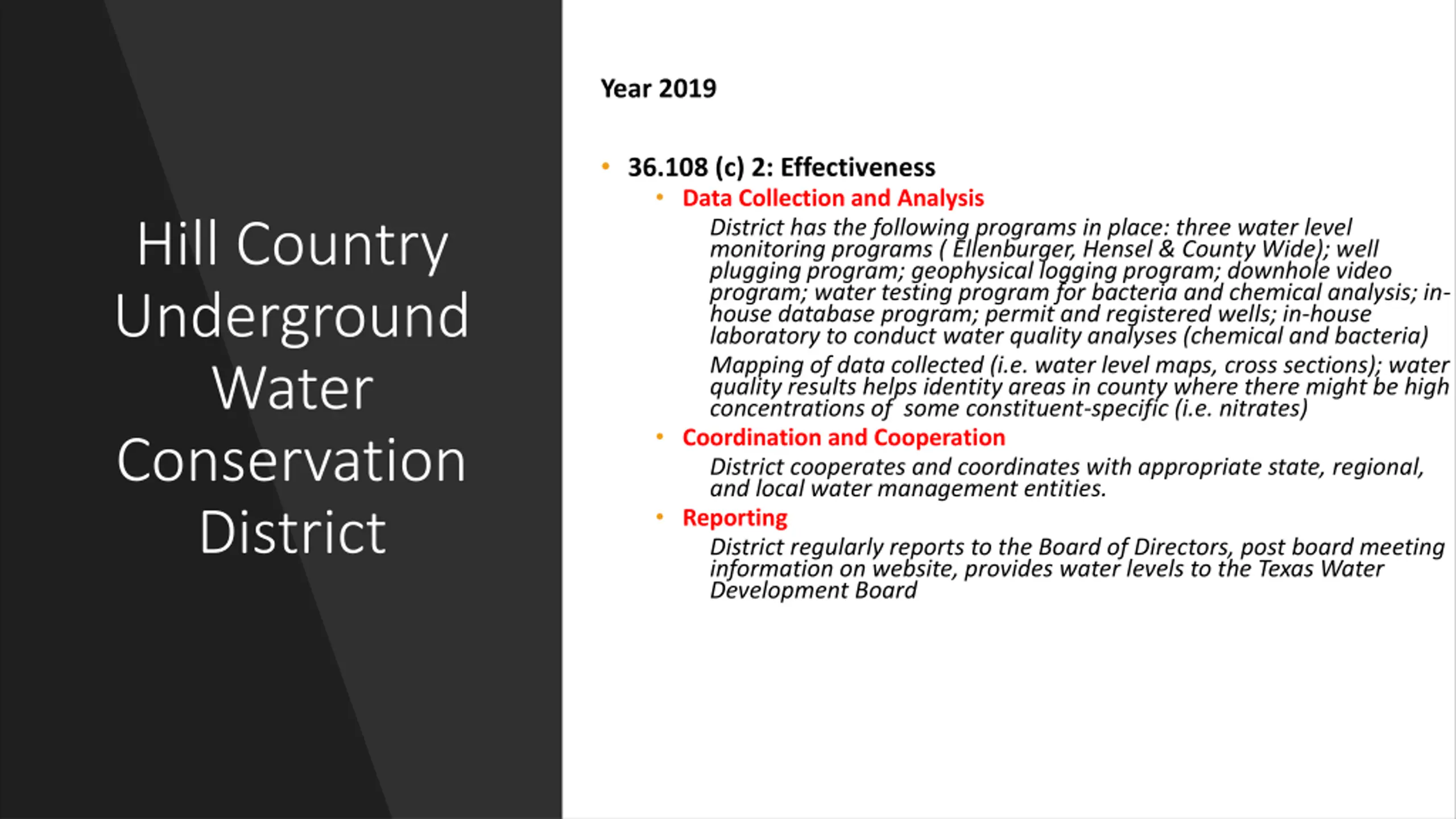 Year 2019 36.108 (c) 2: Effectiveness Data Collection and Analysis District has the following programs in place: three water level monitoring programs ( Ellenburger, Hensel & County Wide); well plugging program; geophysical logging program; downhole video program; water testing program for bacteria and chemical analysis; in- house database program; permit and registered wells; in-house laboratory to conduct water quality analyses (chemical and bacteria) Mapping of data collected (i.e. water level maps, cross sections); water quality results helps identity areas in county where there might be high concentrations of some constituent-specific (i.e. nitrates) Coordination and Cooperation District cooperates and coordinates with appropriate state, regional, and local water management entities. Reporting District regularly reports to the Board of Directors, post board meeting information on website, provides water levels to the Texas Water Development Board Hill Country Underground Water Conservation District