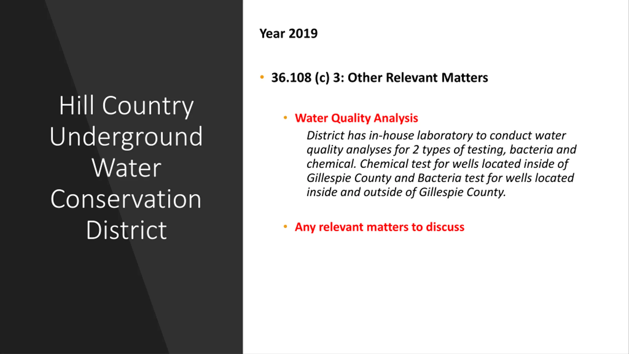 Year 2019 36.108 (c) 3: Other Relevant Matters Hill Country Underground Water Conservation District Water Quality Analysis District has in-house laboratory to conduct water quality analyses for 2 types of testing, bacteria and chemical. Chemical test for wells located inside of Gillespie County and Bacteria test for wells located inside and outside of Gillespie County. Any relevant matters to discuss