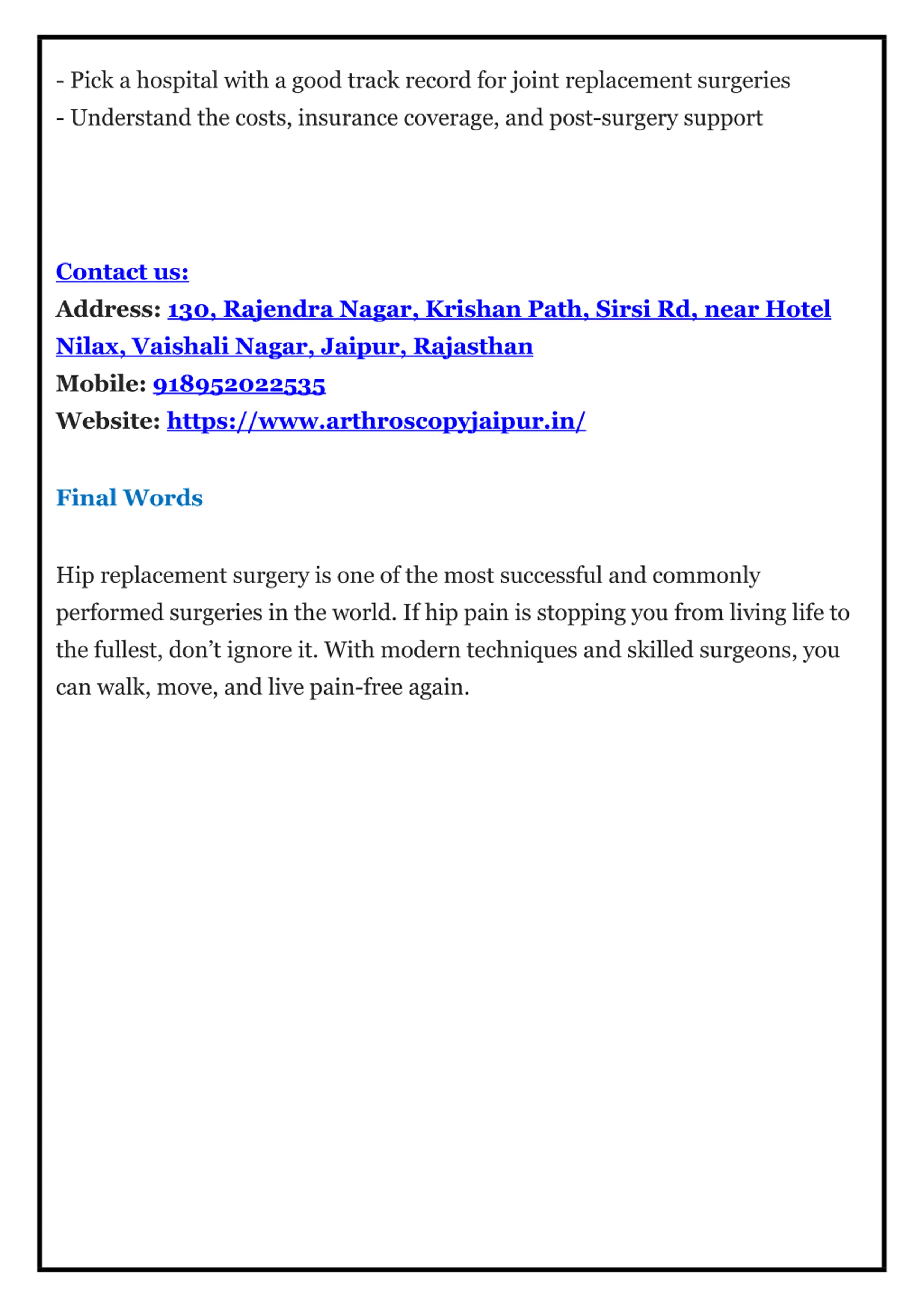 - Pick a hospital with a good track record for joint replacement surgeries - Understand the costs, insurance coverage, and post-surgery support Contact us: Address: 130, Rajendra Nagar, Krishan Path, Sirsi Rd, near Hotel Nilax, Vaishali Nagar, Jaipur, Rajasthan Mobile: 918952022535 Website: https://www.arthroscopyjaipur.in/ Final Words Hip replacement surgery is one of the most successful and commonly performed surgeries in the world. If hip pain is stopping you from living life to the fullest, don t ignore it. With modern techniques and skilled surgeons, you can walk, move, and live pain-free again.