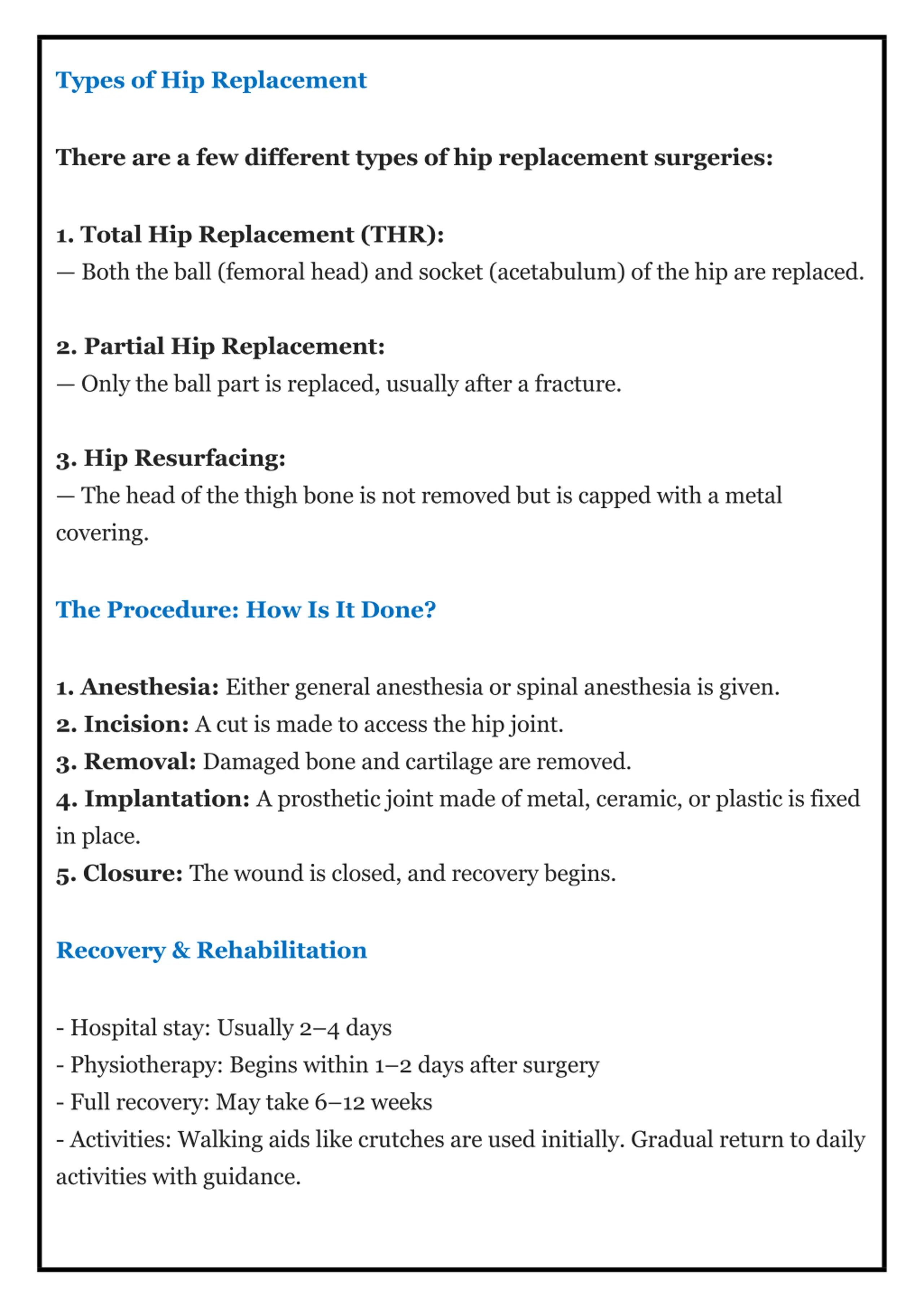 Types of Hip Replacement There are a few different types of hip replacement surgeries: 1. Total Hip Replacement (THR): Both the ball (femoral head) and socket (acetabulum) of the hip are replaced. 2. Partial Hip Replacement: Only the ball part is replaced, usually after a fracture. 3. Hip Resurfacing: The head of the thigh bone is not removed but is capped with a metal covering. The Procedure: How Is It Done? 1. Anesthesia: Either general anesthesia or spinal anesthesia is given. 2. Incision: A cut is made to access the hip joint. 3. Removal: Damaged bone and cartilage are removed. 4. Implantation: A prosthetic joint made of metal, ceramic, or plastic is fixed in place. 5. Closure: The wound is closed, and recovery begins. Recovery & Rehabilitation - Hospital stay: Usually 2 4 days - Physiotherapy: Begins within 1 2 days after surgery - Full recovery: May take 6 12 weeks - Activities: Walking aids like crutches are used initially. Gradual return to daily activities with guidance.