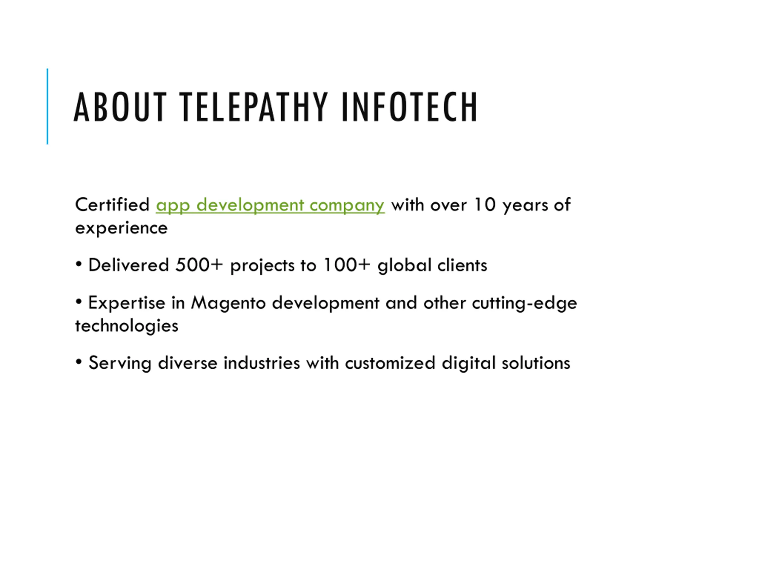 ABOUT TELEPATHY INFOTECH Certified app development company with over 10 years of experience Delivered 500+ projects to 100+ global clients Expertise in Magento development and other cutting-edge technologies Serving diverse industries with customized digital solutions