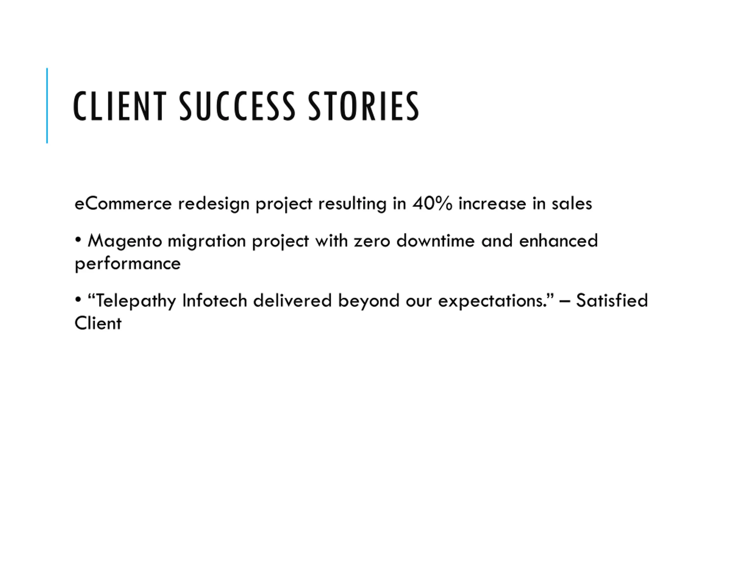 CLIENT SUCCESS STORIES eCommerce redesign project resulting in 40% increase in sales Magento migration project with zero downtime and enhanced performance Telepathy Infotech delivered beyond our expectations. Satisfied Client