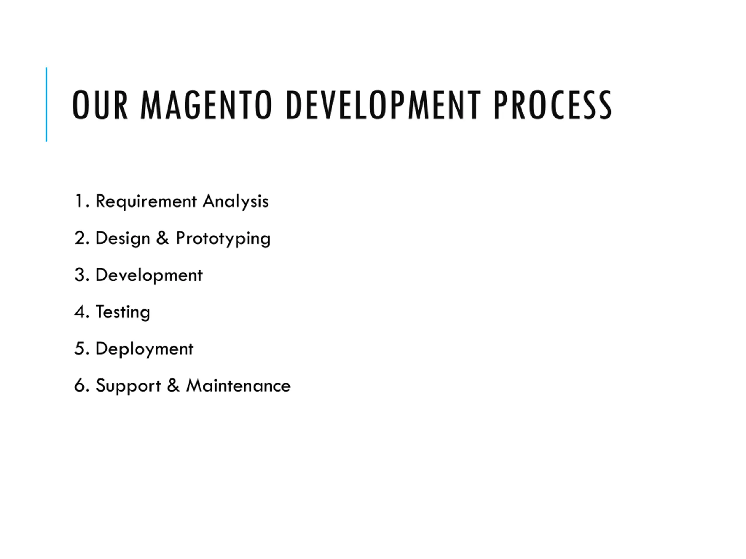 OUR MAGENTO DEVELOPMENT PROCESS 1. Requirement Analysis 2. Design & Prototyping 3. Development 4. Testing 5. Deployment 6. Support & Maintenance