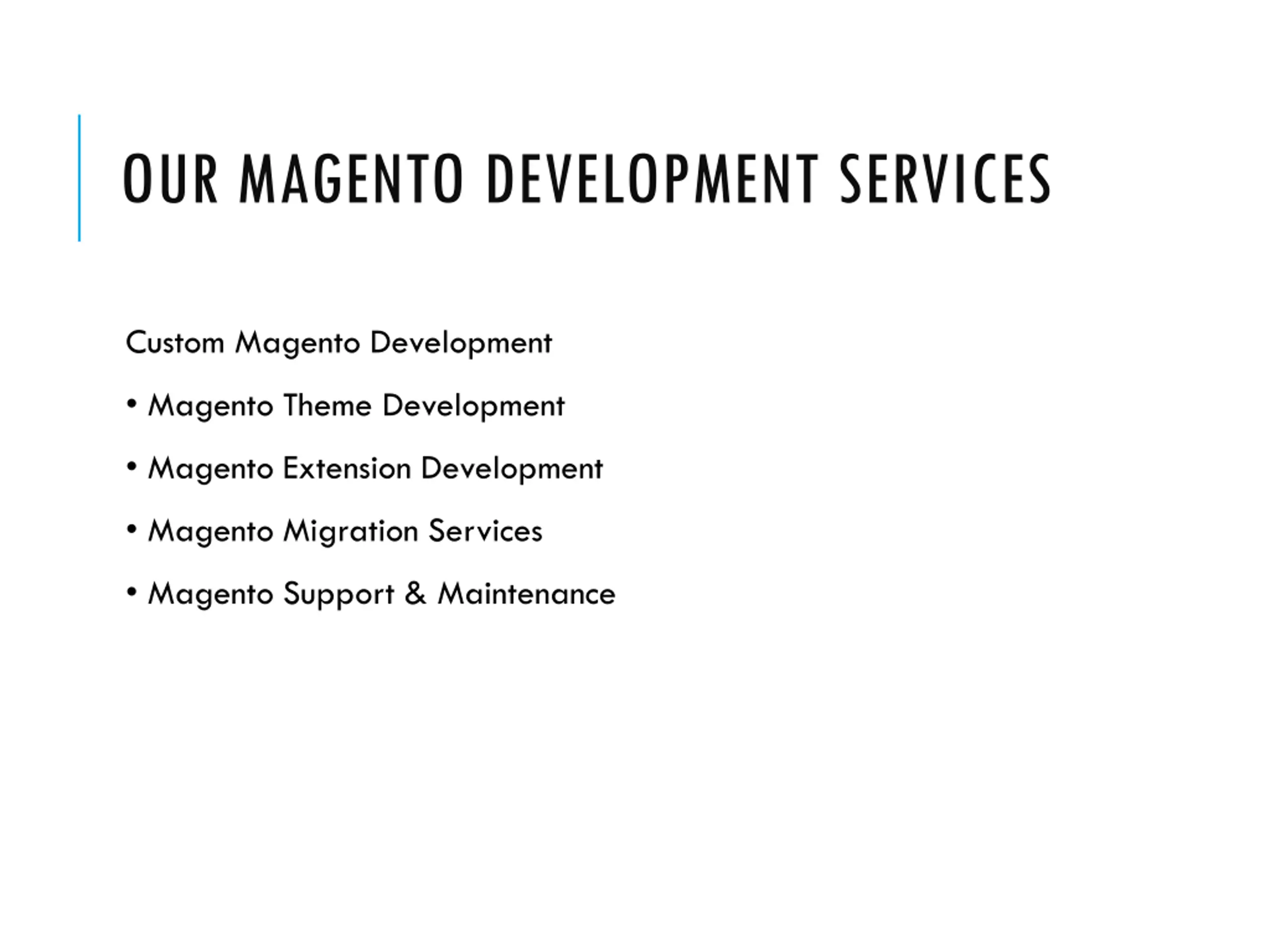 OUR MAGENTO DEVELOPMENT SERVICES Custom Magento Development Magento Theme Development Magento Extension Development Magento Migration Services Magento Support & Maintenance
