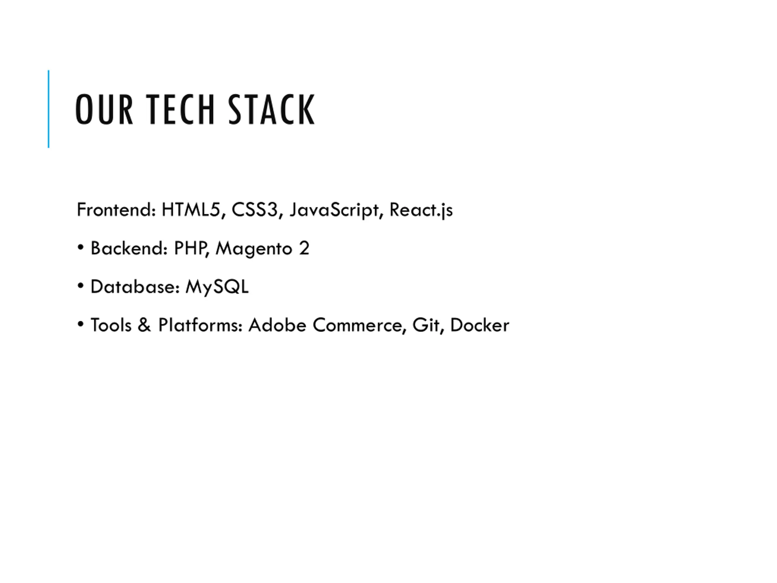 OUR TECH STACK Frontend: HTML5, CSS3, JavaScript, React.js Backend: PHP, Magento 2 Database: MySQL Tools & Platforms: Adobe Commerce, Git, Docker