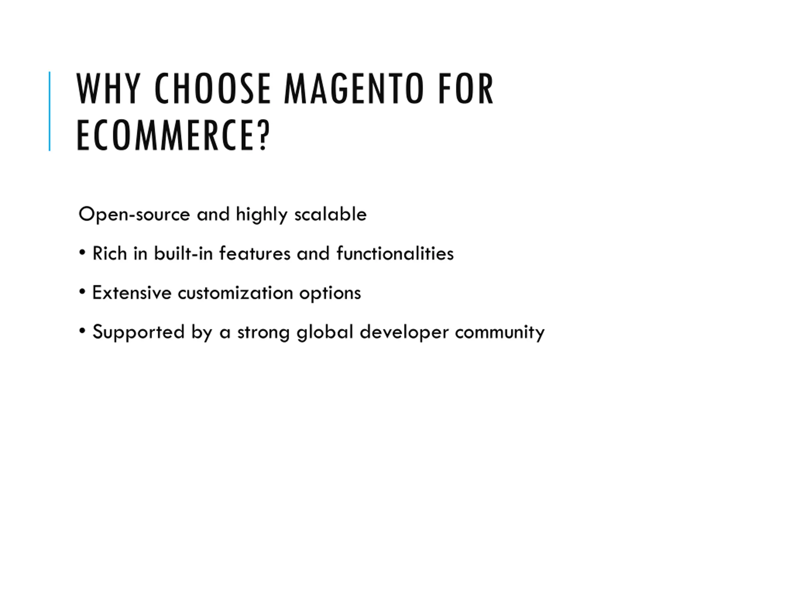 WHY CHOOSE MAGENTO FOR ECOMMERCE? Open-source and highly scalable Rich in built-in features and functionalities Extensive customization options Supported by a strong global developer community