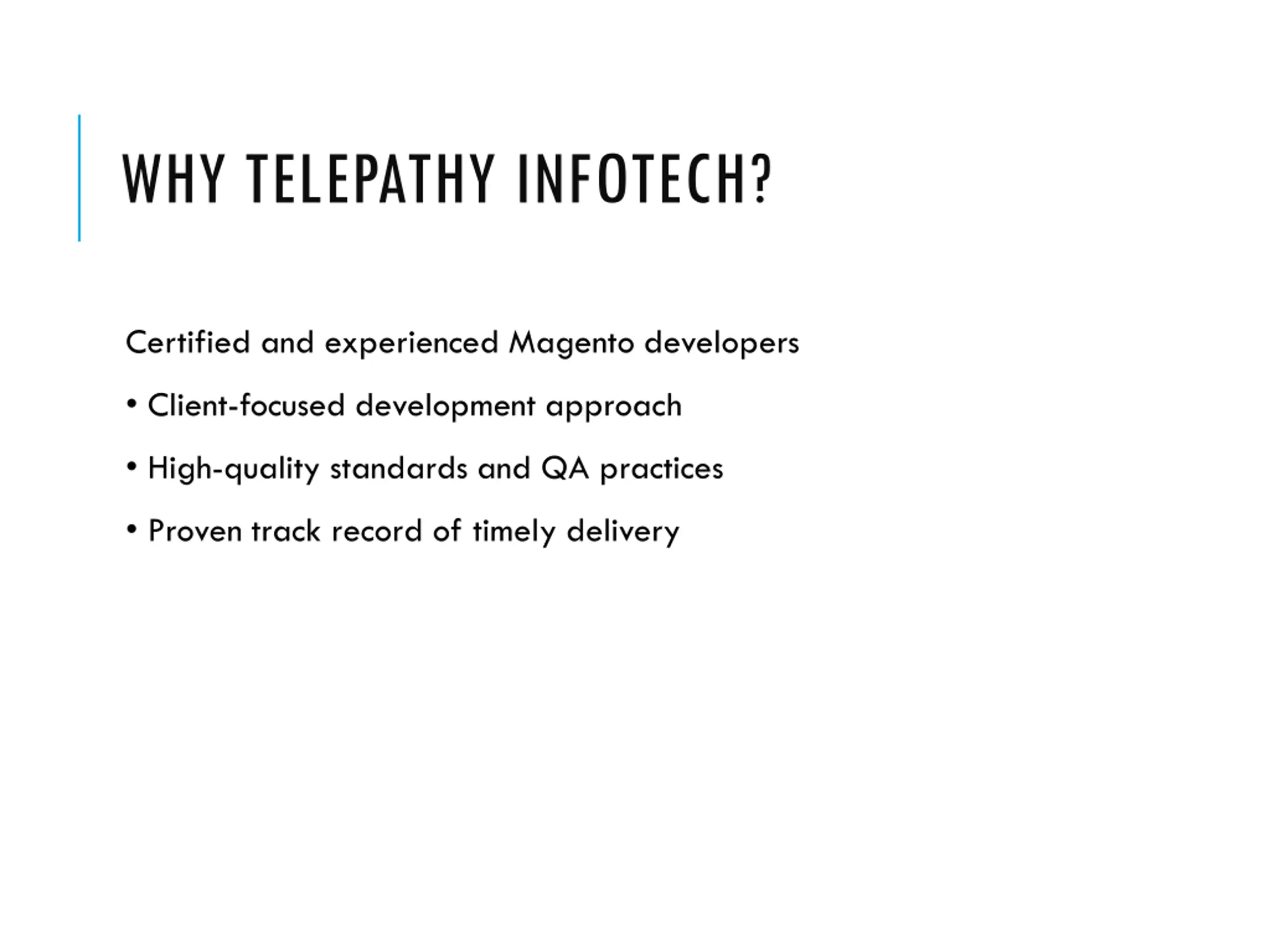 WHY TELEPATHY INFOTECH? Certified and experienced Magento developers Client-focused development approach High-quality standards and QA practices Proven track record of timely delivery