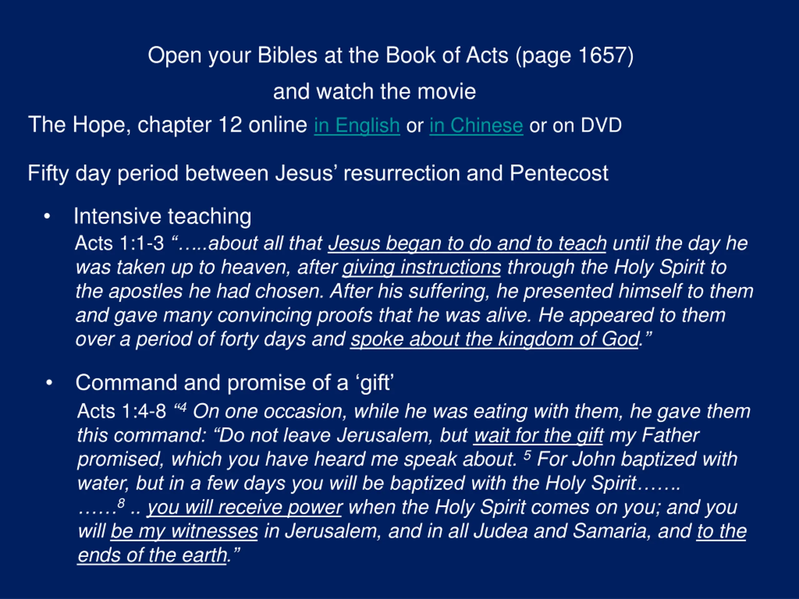 Open your Bibles at the Book of Acts (page 1657) and watch the movie The Hope, chapter 12 online in English or in Chinese or on DVD Fifty day period between Jesus resurrection and Pentecost Intensive teaching Acts 1:1-3 ..about all that Jesus began to do and to teach until the day he was taken up to heaven, after giving instructions through the Holy Spirit to the apostles he had chosen. After his suffering, he presented himself to them and gave many convincing proofs that he was alive. He appeared to them over a period of forty days and spoke about the kingdom of God. Command and promise of a gift Acts 1:4-8 4 On one occasion, while he was eating with them, he gave them this command: Do not leave Jerusalem, but wait for the gift my Father promised, which you have heard me speak about. 5 For John baptized with water, but in a few days you will be baptized with the Holy Spirit . 8 .. you will receive power when the Holy Spirit comes on you; and you will be my witnesses in Jerusalem, and in all Judea and Samaria, and to the ends of the earth.
