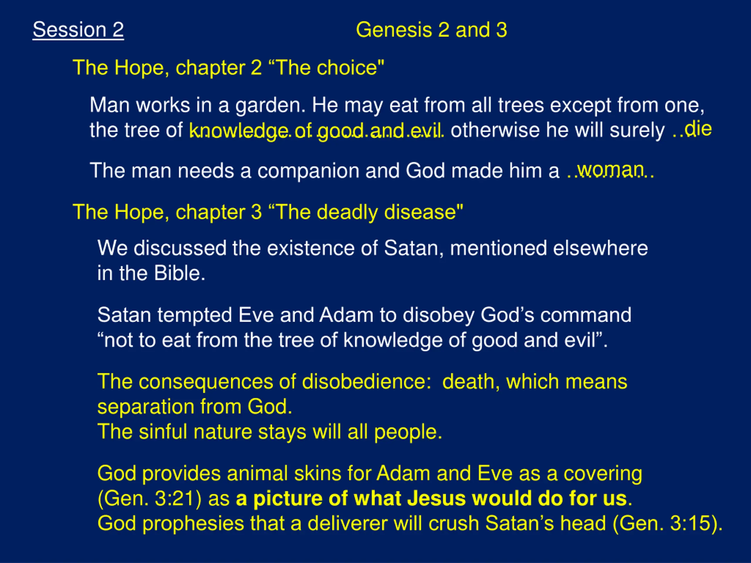 Session 2 Genesis 2 and 3 The Hope, chapter 2 The choice" Man works in a garden. He may eat from all trees except from one, the tree of . otherwise he will surely . knowledge of good and evil die woman The man needs a companion and God made him a . The Hope, chapter 3 The deadly disease" We discussed the existence of Satan, mentioned elsewhere in the Bible. Satan tempted Eve and Adam to disobey God s command not to eat from the tree of knowledge of good and evil . The consequences of disobedience: death, which means separation from God. The sinful nature stays will all people. God provides animal skins for Adam and Eve as a covering (Gen. 3:21) as a picture of what Jesus would do for us. God prophesies that a deliverer will crush Satan s head (Gen. 3:15).