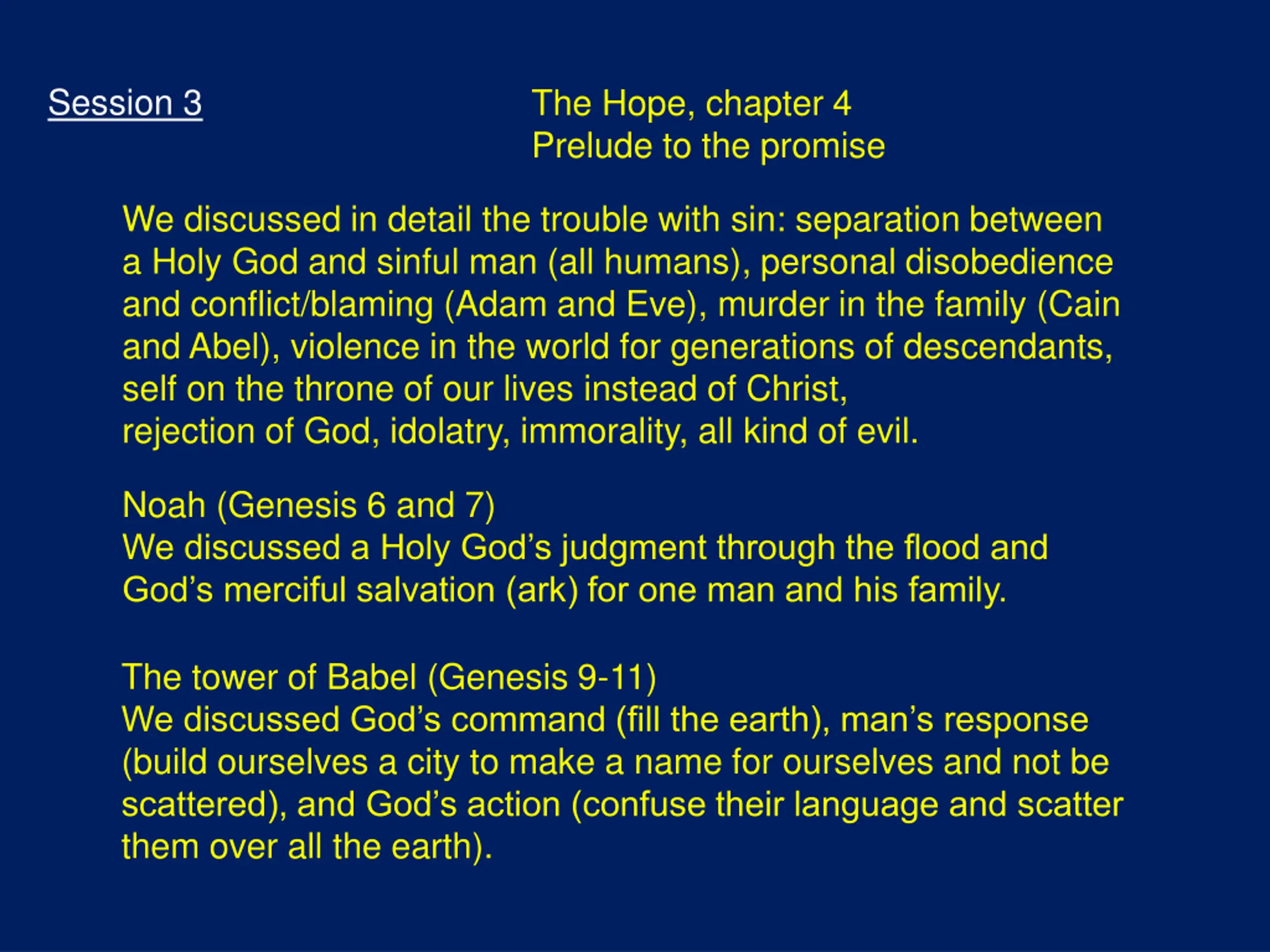 Session 3 The Hope, chapter 4 Prelude to the promise We discussed in detail the trouble with sin: separation between a Holy God and sinful man (all humans), personal disobedience and conflict/blaming (Adam and Eve), murder in the family (Cain and Abel), violence in the world for generations of descendants, self on the throne of our lives instead of Christ, rejection of God, idolatry, immorality, all kind of evil. Noah (Genesis 6 and 7) We discussed a Holy God s judgment through the flood and God s merciful salvation (ark) for one man and his family. The tower of Babel (Genesis 9-11) We discussed God s command (fill the earth), man s response (build ourselves a city to make a name for ourselves and not be scattered), and God s action (confuse their language and scatter them over all the earth).
