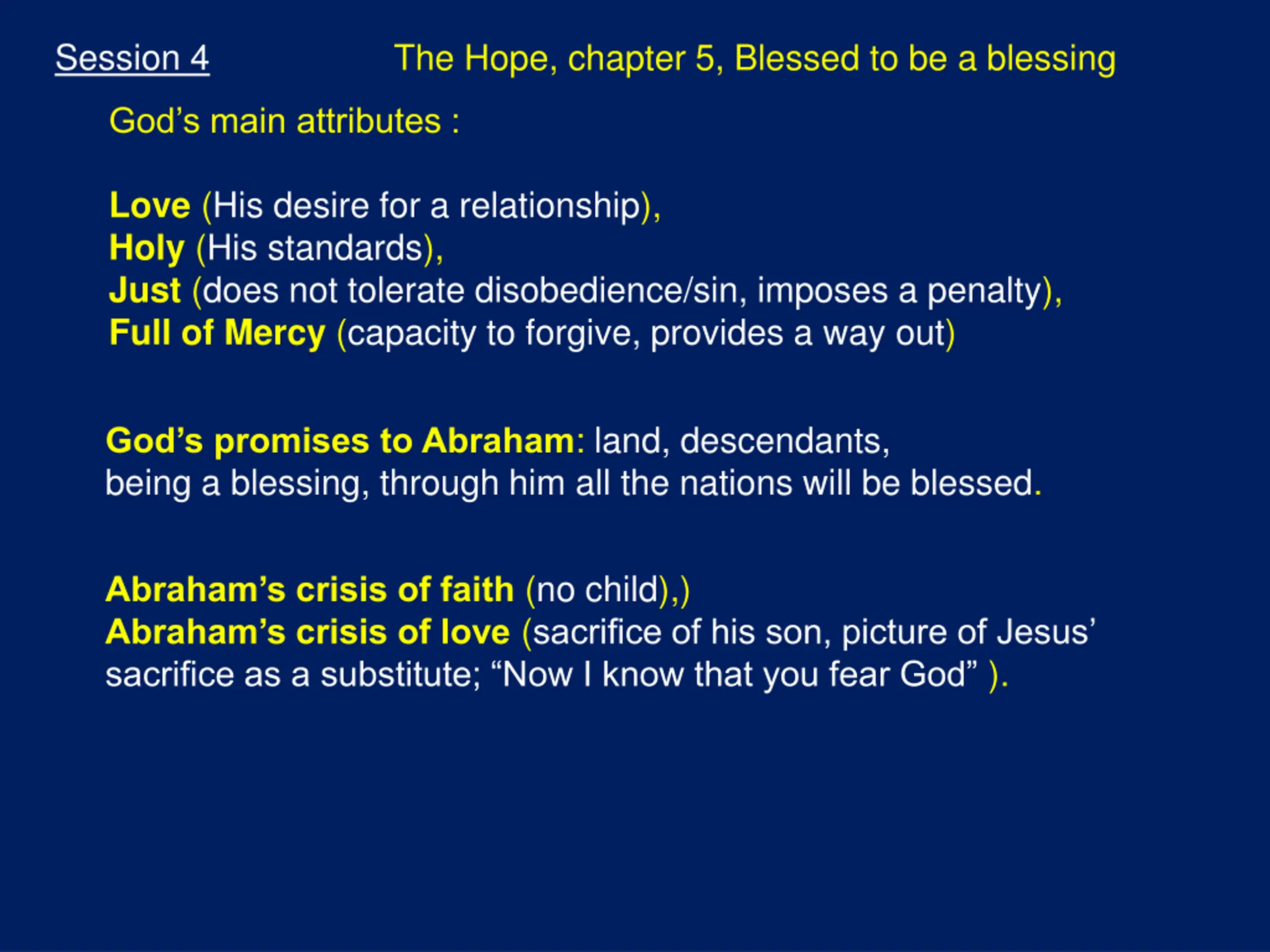 Session 4 The Hope, chapter 5, Blessed to be a blessing God s main attributes : Love (His desire for a relationship), Holy (His standards), Just (does not tolerate disobedience/sin, imposes a penalty), Full of Mercy (capacity to forgive, provides a way out) God s promises to Abraham: land, descendants, being a blessing, through him all the nations will be blessed. Abraham s crisis of faith (no child),) Abraham s crisis of love (sacrifice of his son, picture of Jesus sacrifice as a substitute; Now I know that you fear God ).
