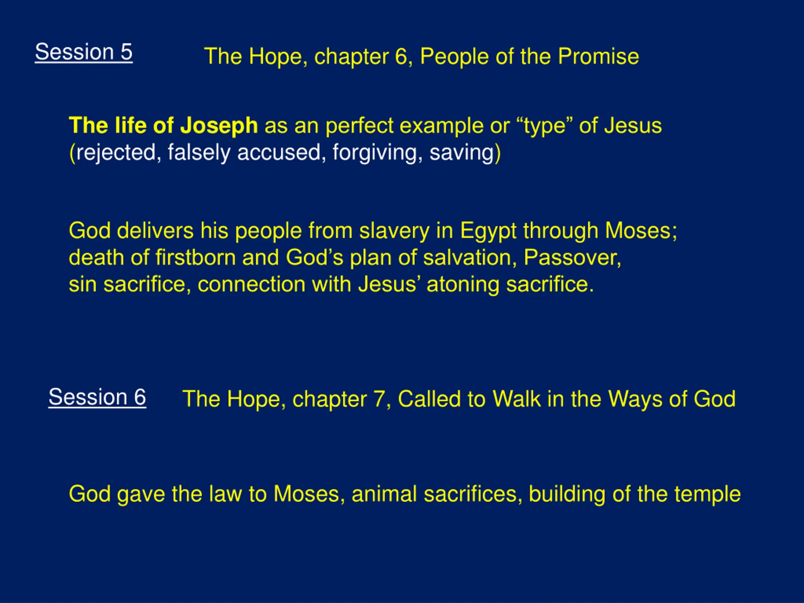 Session 5 The Hope, chapter 6, People of the Promise The life of Joseph as an perfect example or type of Jesus (rejected, falsely accused, forgiving, saving) God delivers his people from slavery in Egypt through Moses; death of firstborn and God s plan of salvation, Passover, sin sacrifice, connection with Jesus atoning sacrifice. Session 6 The Hope, chapter 7, Called to Walk in the Ways of God God gave the law to Moses, animal sacrifices, building of the temple