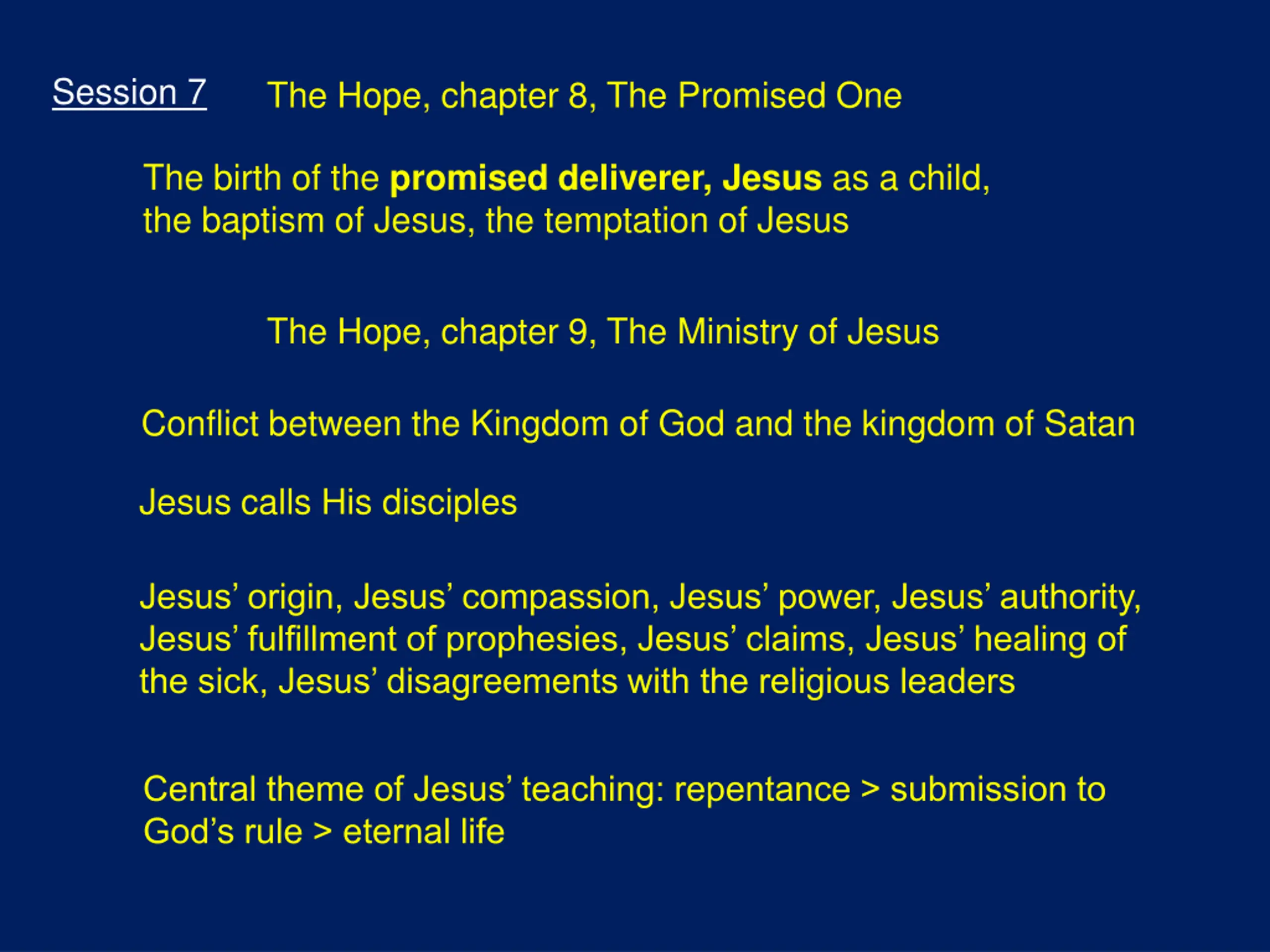 Session 7 The Hope, chapter 8, The Promised One The birth of the promised deliverer, Jesus as a child, the baptism of Jesus, the temptation of Jesus The Hope, chapter 9, The Ministry of Jesus Conflict between the Kingdom of God and the kingdom of Satan Jesus calls His disciples Jesus origin, Jesus compassion, Jesus power, Jesus authority, Jesus fulfillment of prophesies, Jesus claims, Jesus healing of the sick, Jesus disagreements with the religious leaders Central theme of Jesus teaching: repentance > submission to God s rule > eternal life
